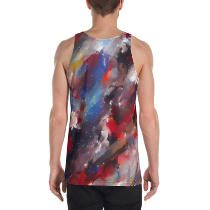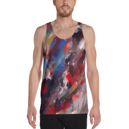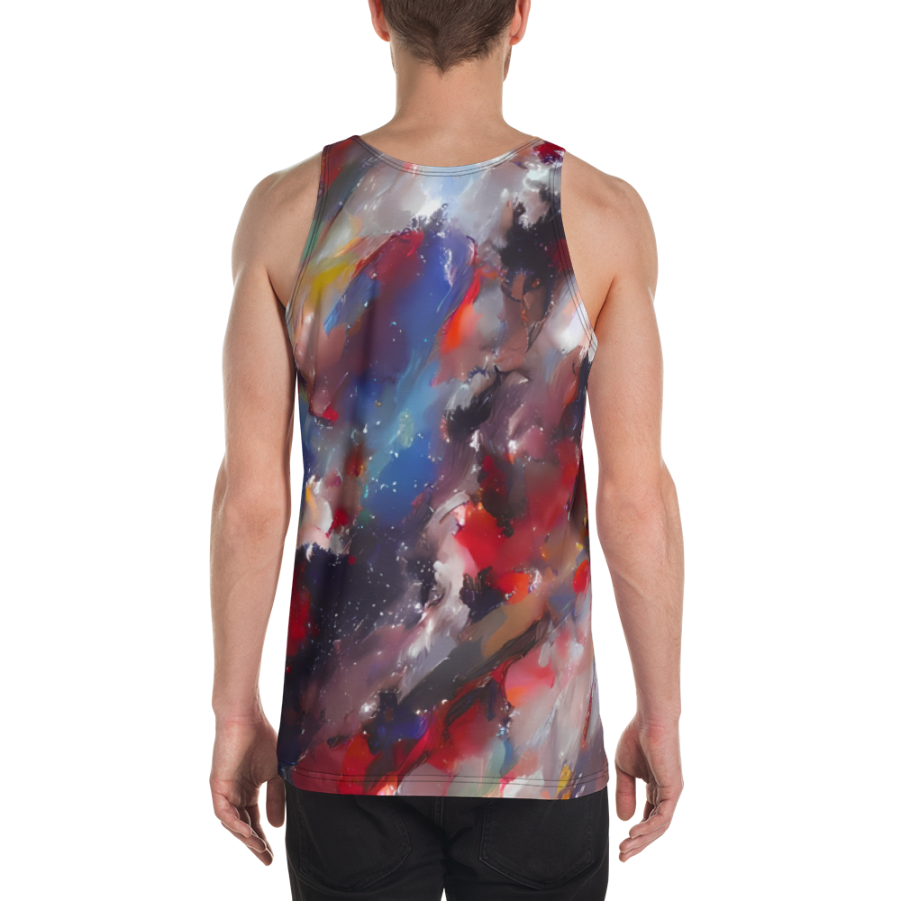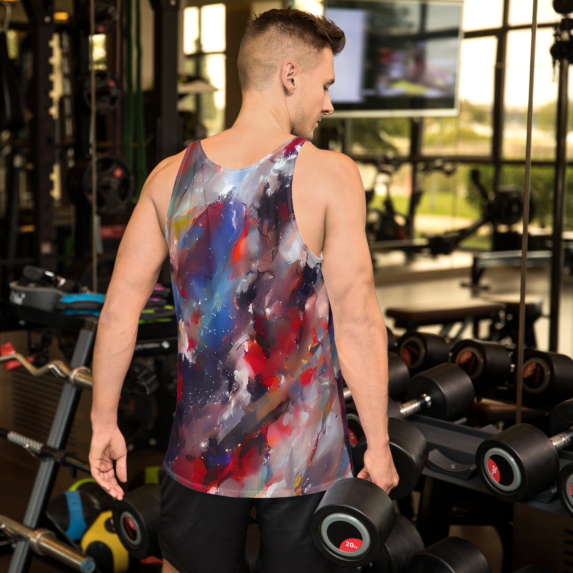 Unleash the artist within and make a bold statement with our Men's Tank Top adorned in the "Passionate Brush" pattern. Inspired by the fervent emotion of Andre Kohn and Cecily Brown's works, this tank top features a vibrant dance of rich reds, deep blues, and warm neutrals. Dynamic strokes and energetic splashes across the fabric create a luxurious depth that captivates the eye and invites touch. Perfect for the bold, creative spirit, this tank top is your canvas for self-expression at art events, autumnal gatherings, or any setting where passion and flair are the guests of honor.