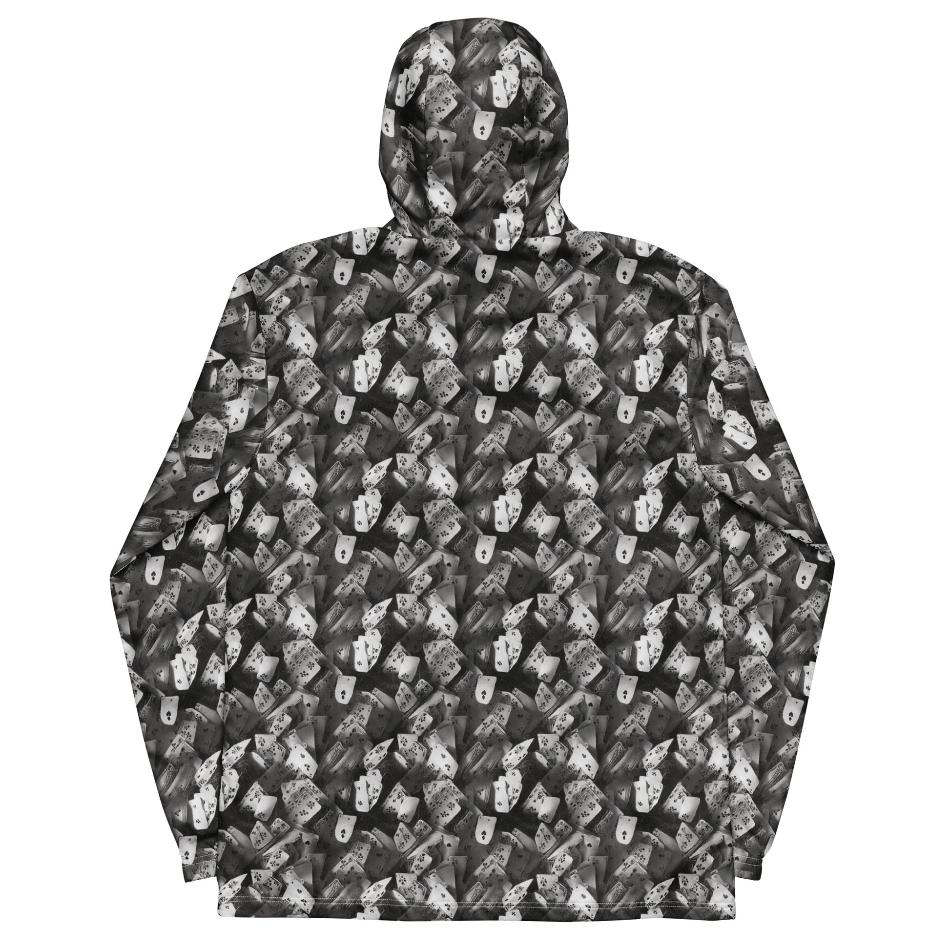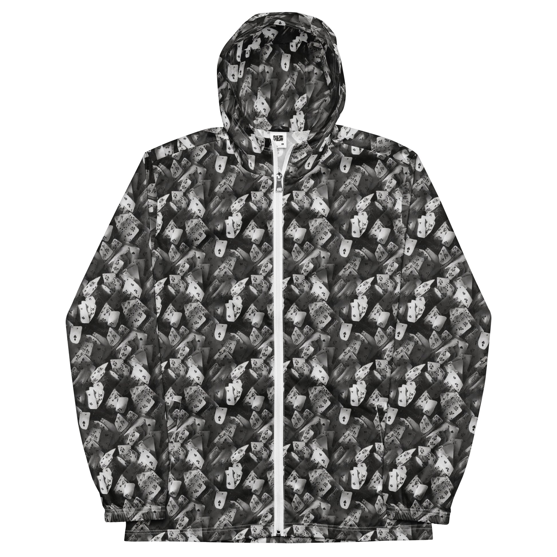 Unleash your adventurous spirit with our "Fortune's Folly" Men's Windbreaker, where whimsical chaos meets sophisticated style. This lightweight, monochrome windbreaker features a striking pattern of scattered playing cards, enveloped in a surreal texture that evokes intrigue and mystery. Perfect for autumn gatherings or avant-garde events, it’s designed for those who thrive on the unexpected. Stay stylish and shielded, making a bold statement wherever you go!