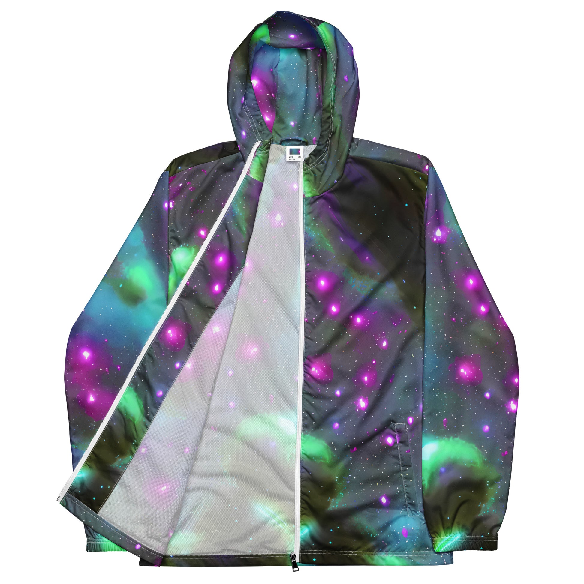 Elevate your outerwear game with our "Interstellar Haze" Men's Windbreaker, where cosmic elegance meets urban style. This lightweight windbreaker features a mesmerizing blend of deep purples, ethereal blues, and vibrant greens, reminiscent of a cosmic nebula swirling around you. Perfect for evening events or art gallery openings, it’s designed for those who dare to stand out while staying shielded from the elements.