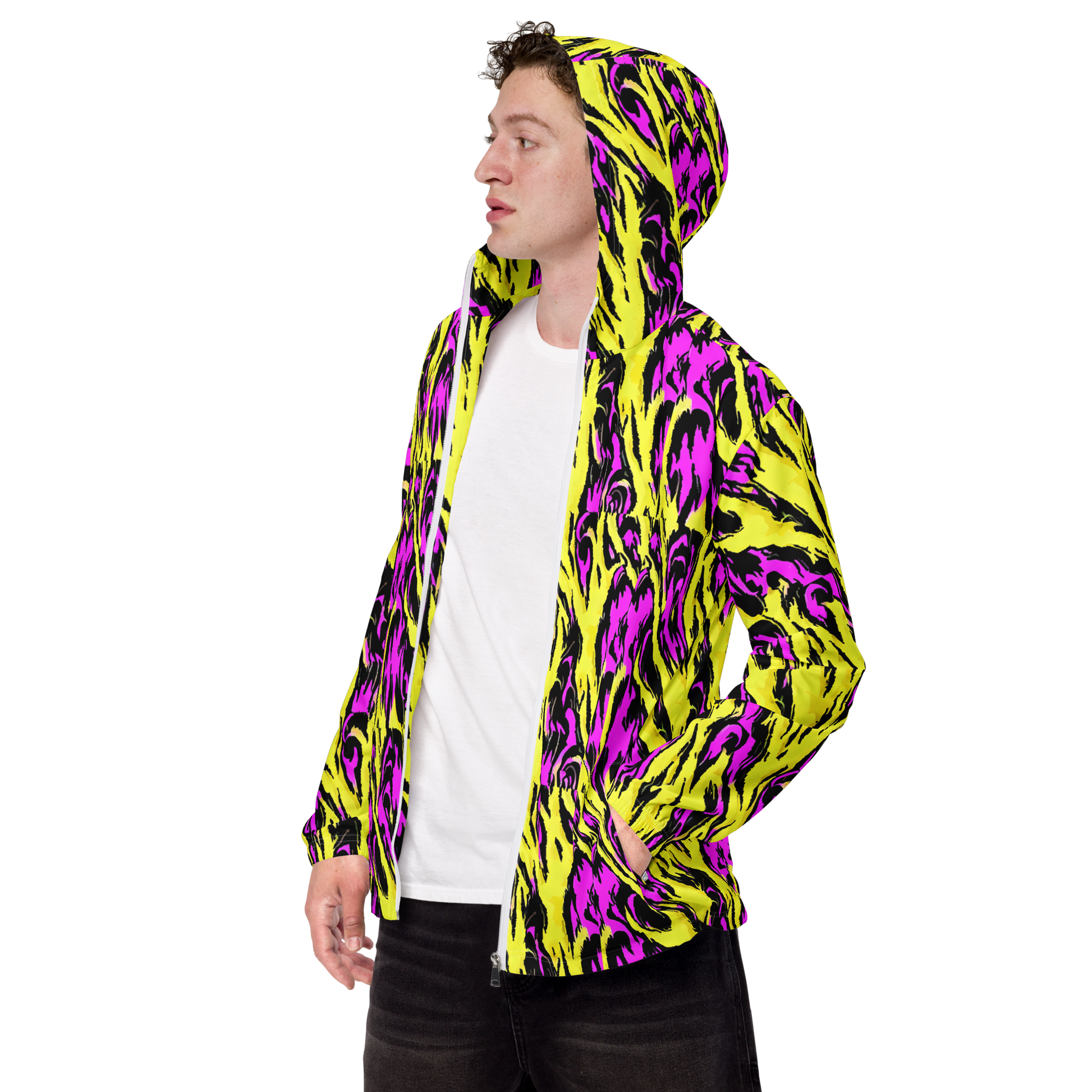 Embrace the untamed essence of the wild with our latest lightweight windbreaker, featuring a dazzling array of bold stripes that capture the electrifying spirit of zebras under a neon sky. The vibrant yellows and striking pinks interplay on the fabric, offering a visually stunning and tactile experience that's perfect for making a statement at summer festivals, electrifying the nightlife, or simply showcasing your adventurous side.