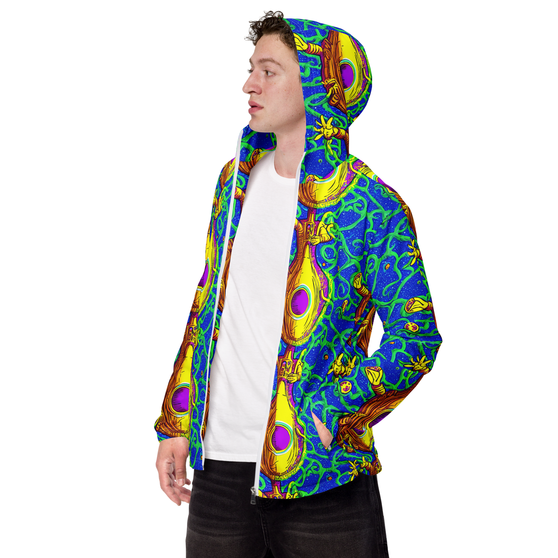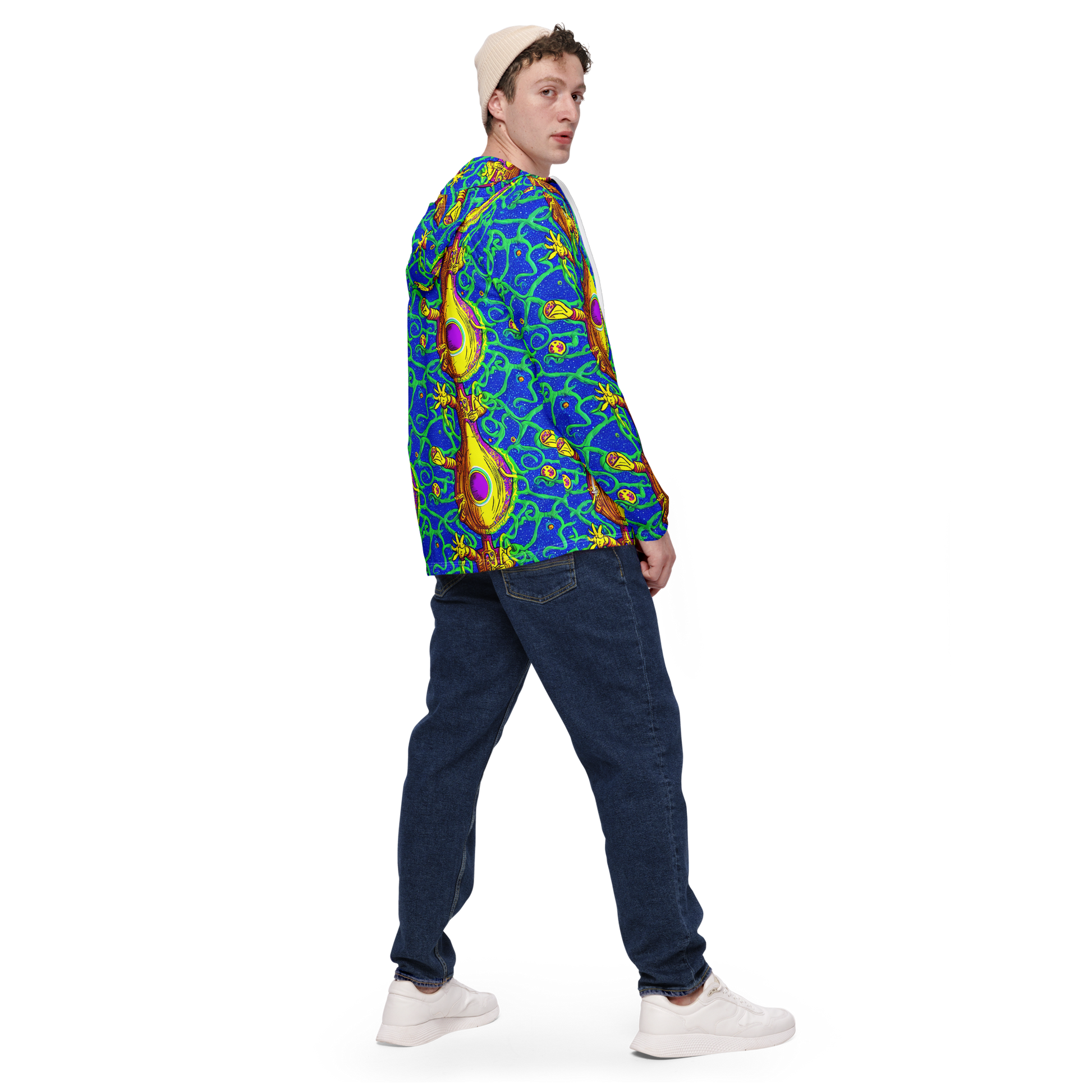 Embrace the elements in style with our Men's Windbreaker, enveloped in a mesmerizing pattern that's as bold as it is imaginative. This jacket is a wearable canvas showcasing a vibrant fusion of electric blues and vivid yellows, adorned with playful characters and surreal shapes that float against a cosmic backdrop. It's more than a piece of clothing—it's a statement for the audacious spirit, perfect for those who shine at music festivals and celebrate creativity wherever they go.