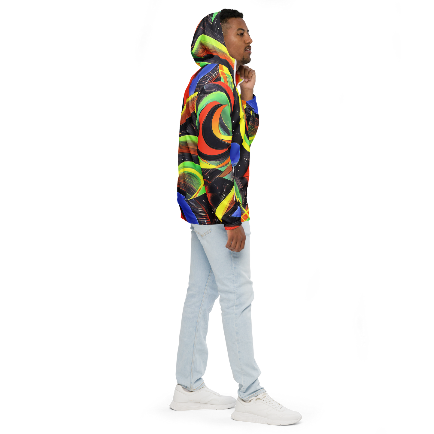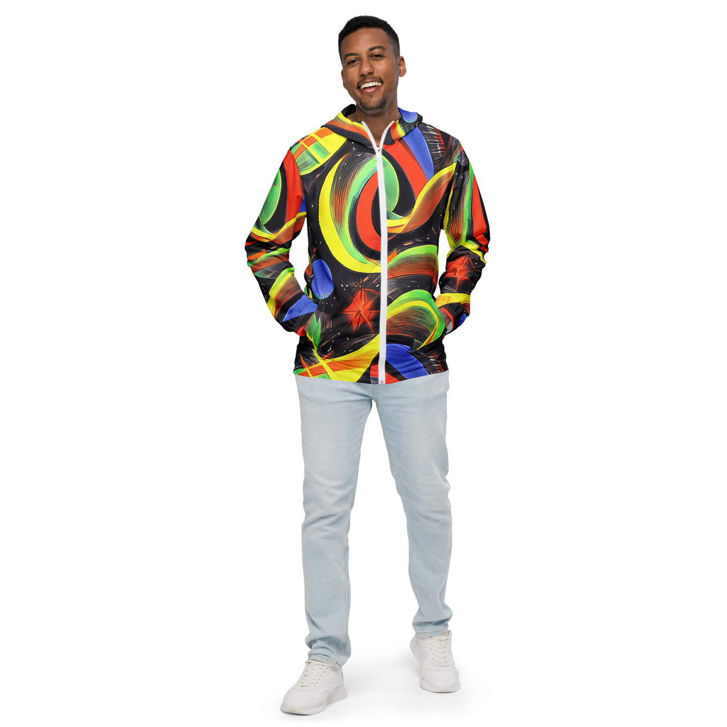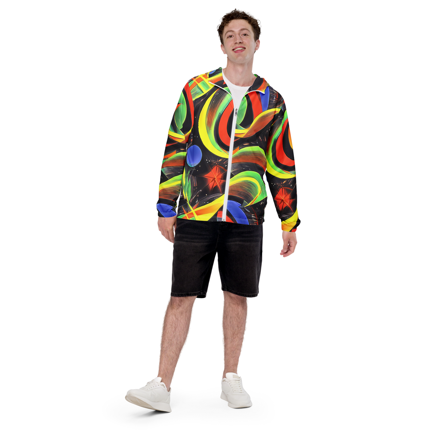 Embrace the enchantment of our latest Men's Windbreaker, enveloped in a mesmerizing tapestry of swirling shapes and a kaleidoscope of colors. With a glossy finish that brings the fantasy of fairy tales to life, this jacket is your ticket to a stylish adventure, perfect for spring and summer escapades or standing out at creative events.