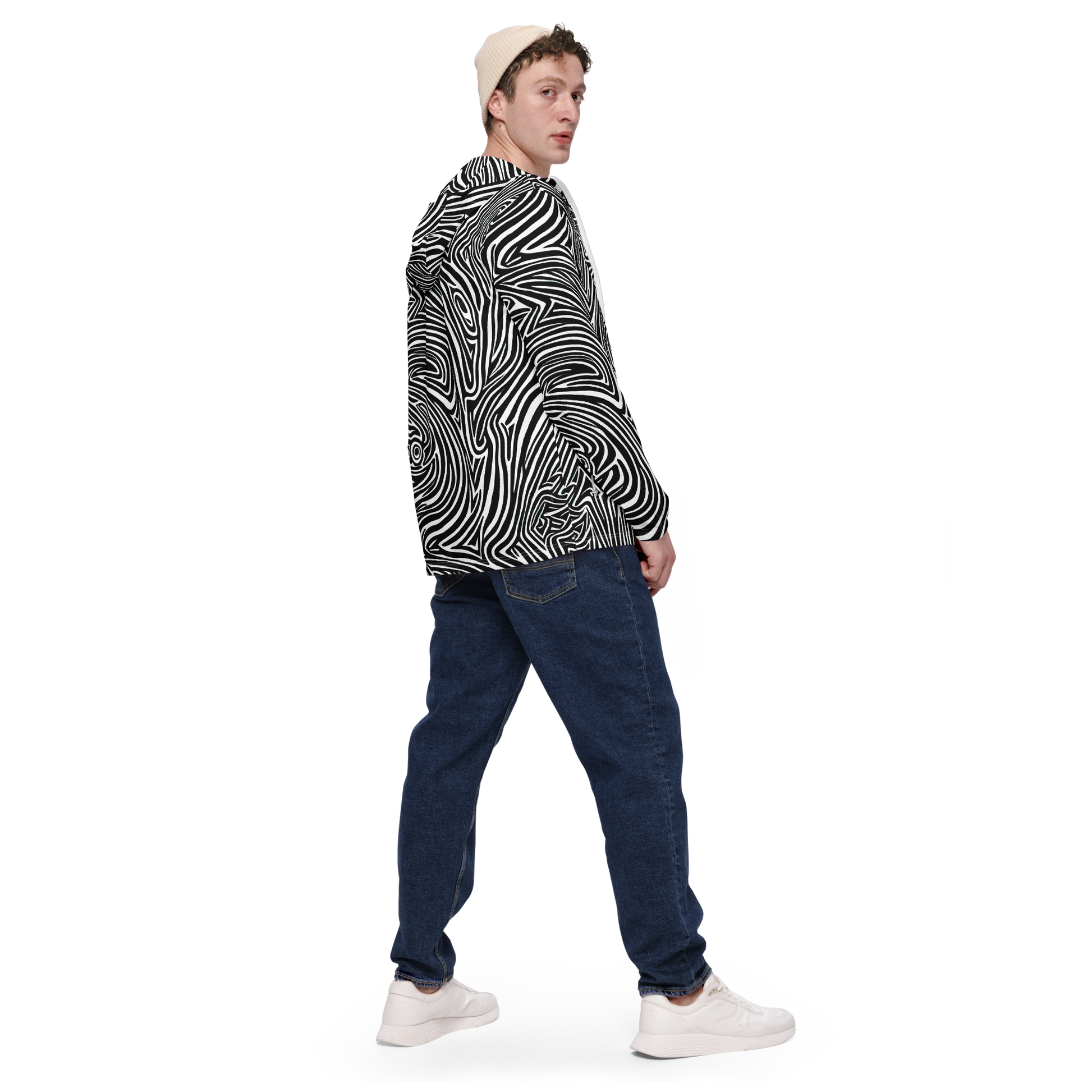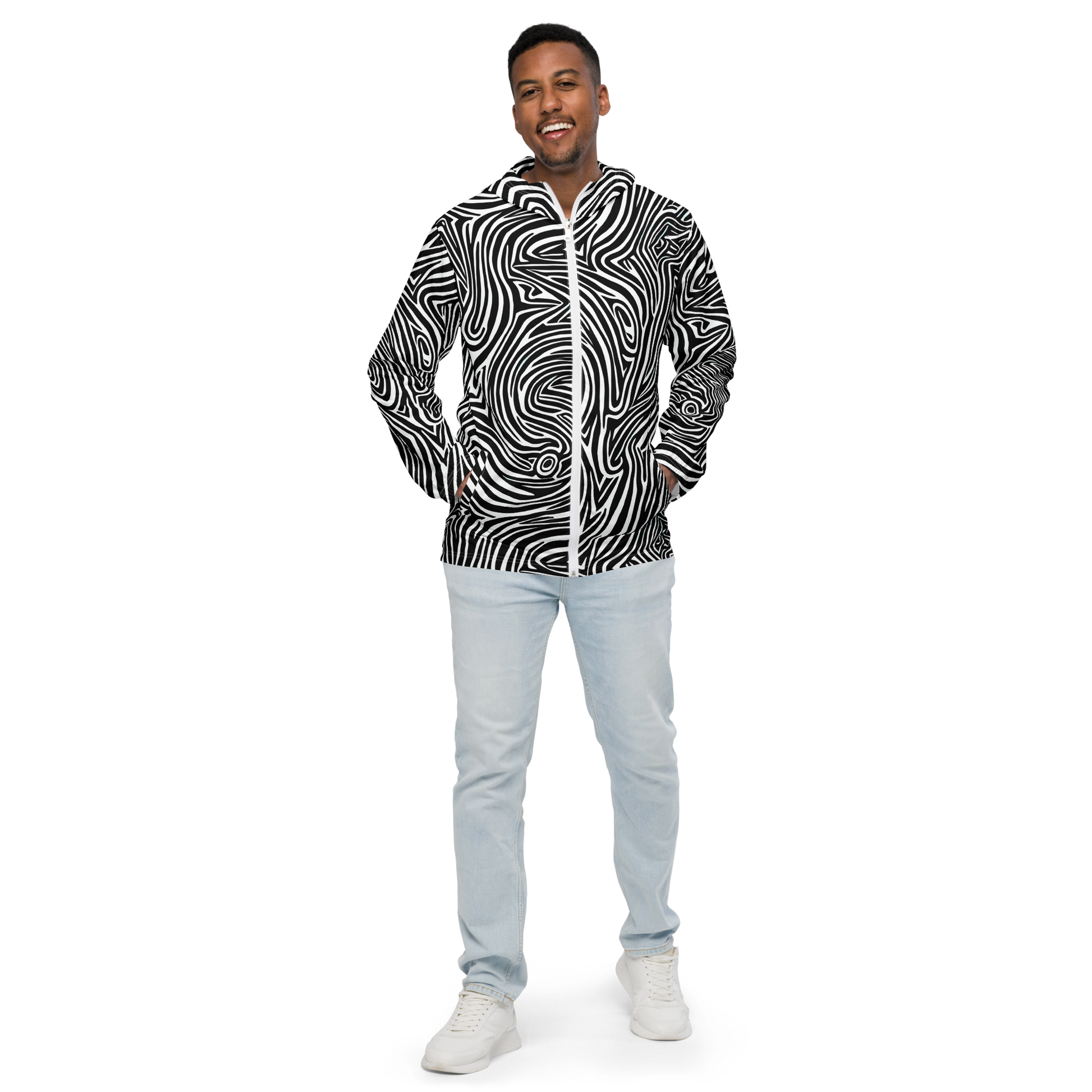 Elevate your outerwear game with our AI-designed lightweight windbreaker, featuring a dynamic black and white pattern that intertwines fluid, swirling lines. This intricate, hypnotic design evokes a sense of movement and depth, making it perfect for artistic events, gallery openings, or trendy urban settings. Ideal for fall and winter, this windbreaker suits those with a creative, daring personality who appreciate the fusion of contemporary art and fashion.