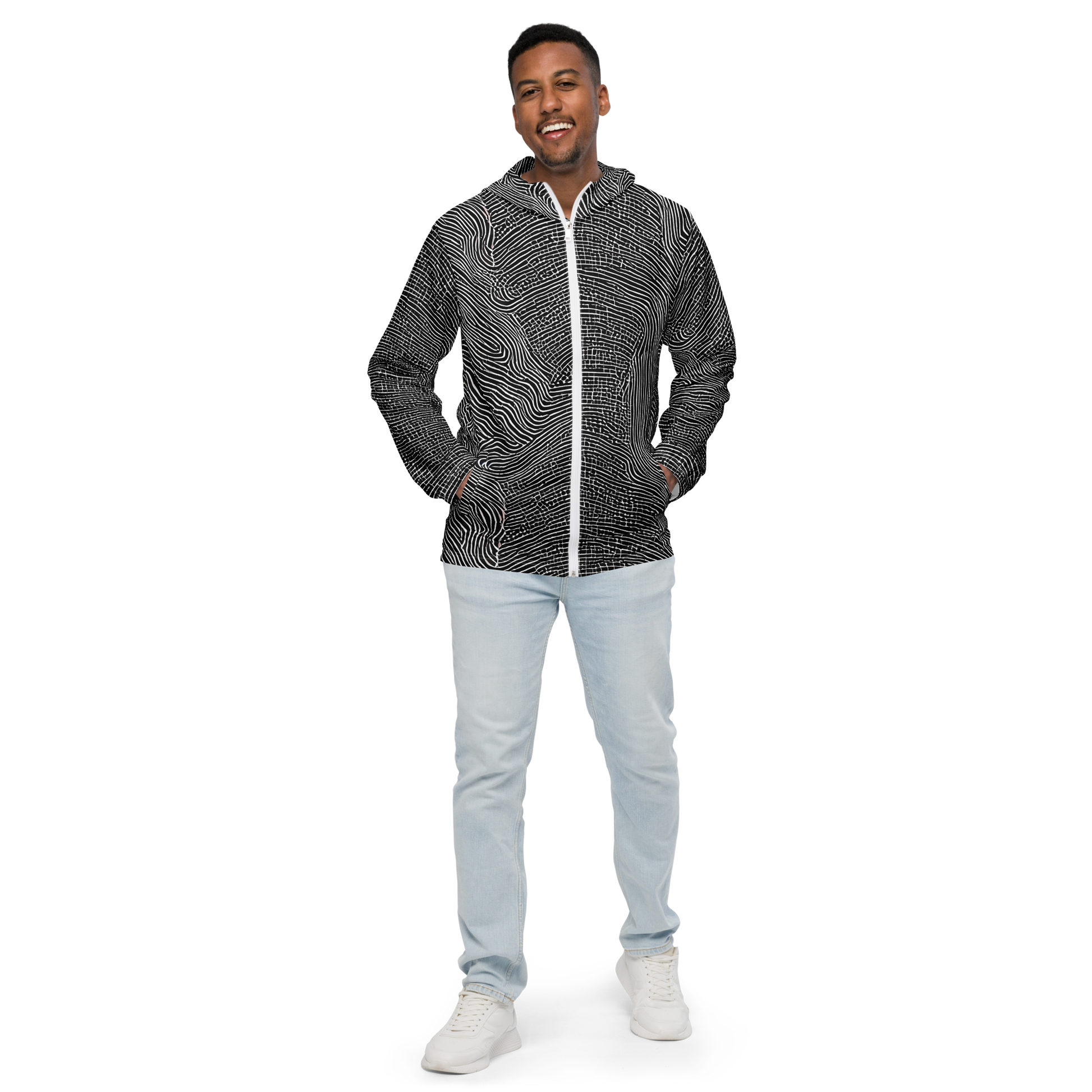 Elevate your outerwear game with our AI-designed Men's Windbreaker featuring the striking "Zenith Stripes" pattern. This lightweight, water-resistant jacket showcases a mesmerizing interplay of fluid black and white lines, creating a dynamic aesthetic that captures attention and exudes sophistication. Perfect for avant-garde gatherings or art gallery events, it seamlessly blends artistic expression with modern elegance, ensuring you navigate any weather in style.