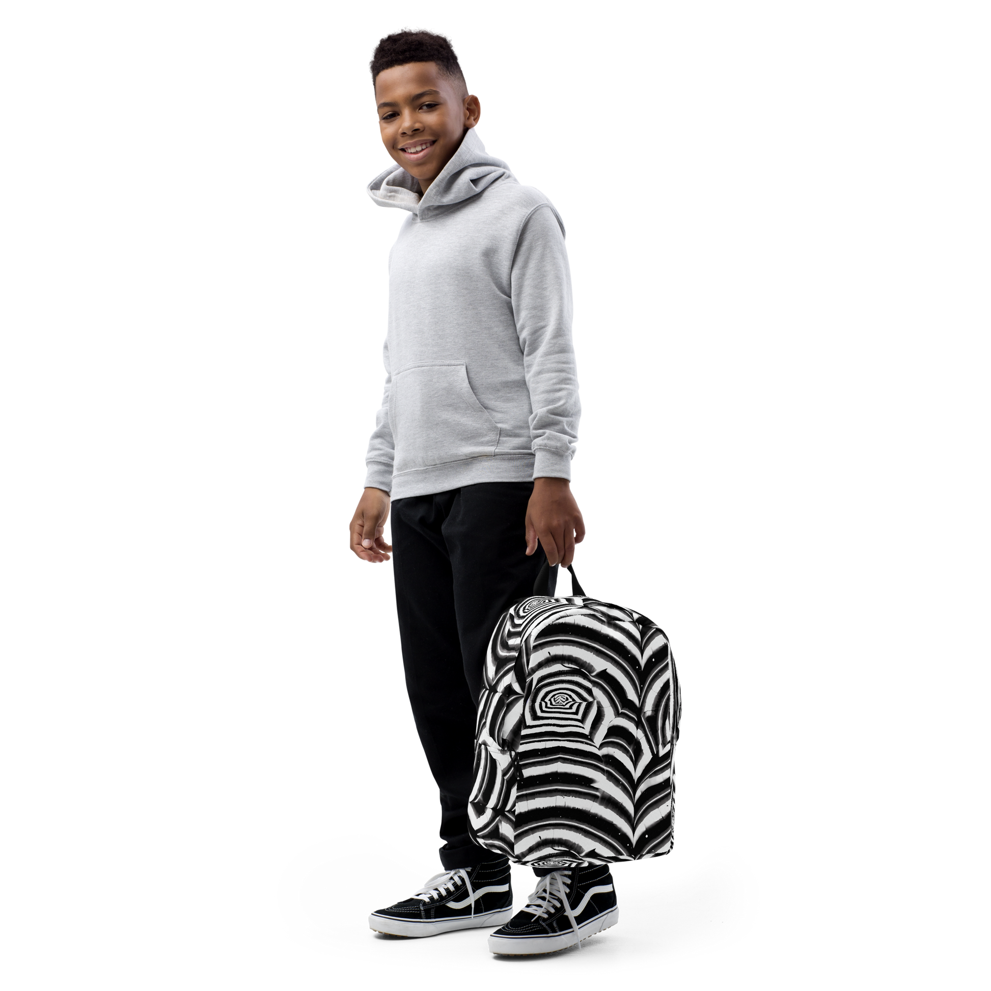 Step into the vanguard of fashion and functionality with our Minimalist Backpack, adorned with a hypnotic blend of monochromatic swirls and stripes that will captivate the eye and spark the imagination. This exclusive design, reminiscent of a cosmic voyage through the abstract, offers a striking balance between modern edge and organic fluidity. It's the ultimate accessory for those who dare to stand out and embrace the artistry of light and shadow in their everyday journey.