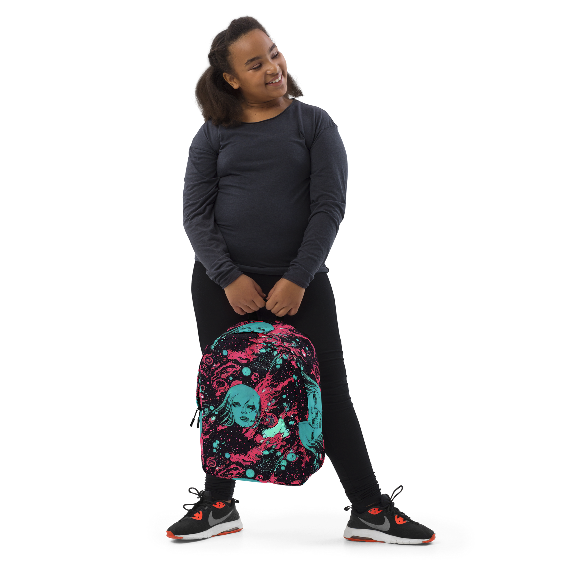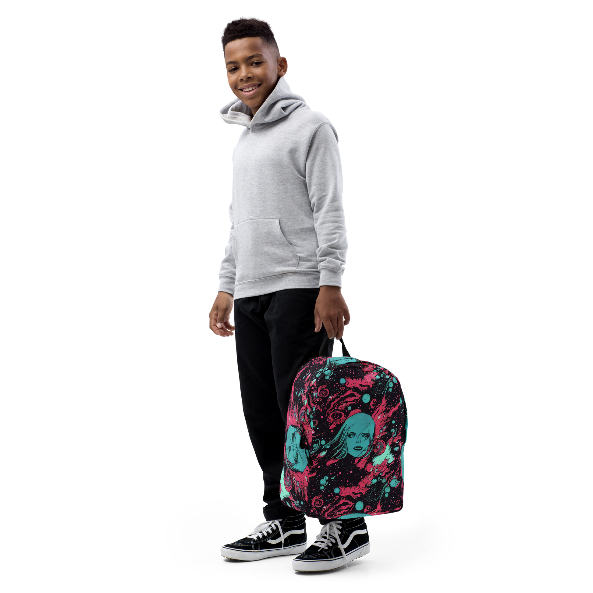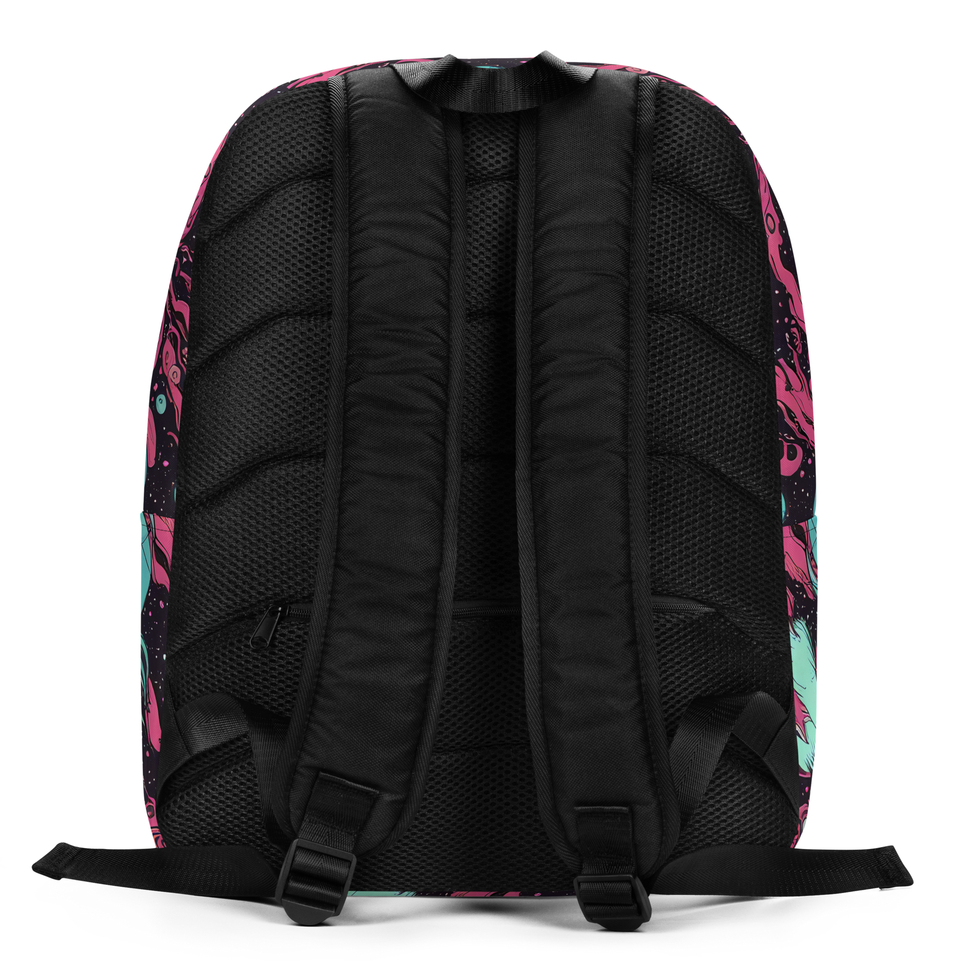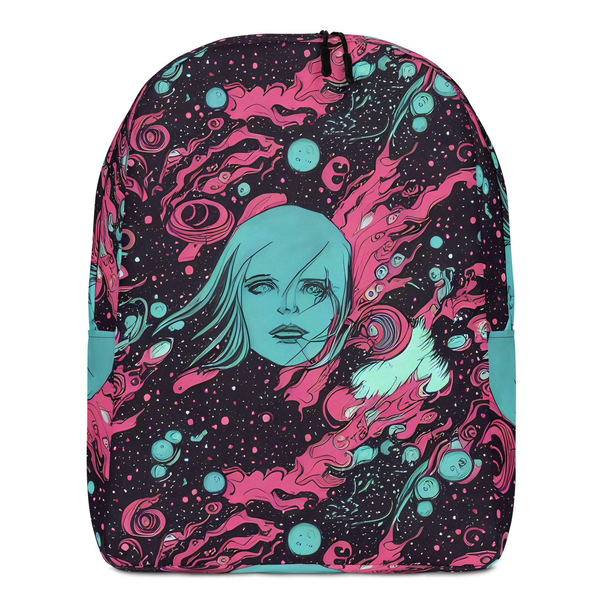 Step into a universe of mystique with our Minimalist Backpack, wrapped in a mesmerizing design that beckons the eye and stirs the soul. The vibrant pink and turquoise swirls interlace with celestial motifs upon a profound black canvas, highlighted by a sketched visage that whispers tales of the cosmos. An expression of artistry and wonder, this backpack is your perfect companion for standing out at creative gatherings or basking in the energy of music festivals, crafted for the bold and the spirited.