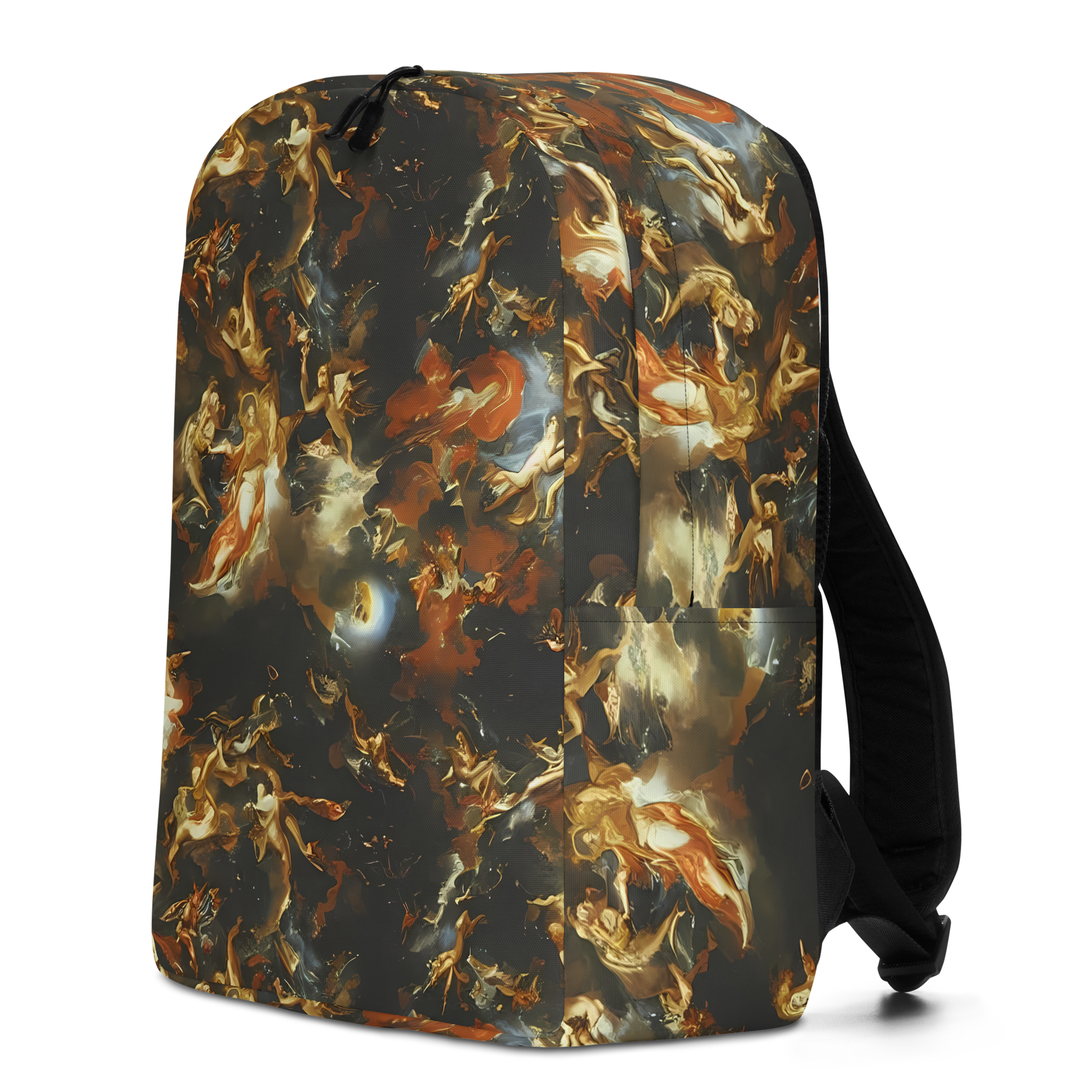 Immerse yourself in the opulence of the universe with our Minimalist Backpack, featuring a mesmerizing design that marries the grandeur of Baroque art with the boundless beauty of the cosmos. Swathed in a vortex of golden, amber, and ebony, this backpack carries your essentials in a pattern that captures the drama of a starlit sky and the ethereal essence of timeless art. It's not just a backpack; it's a portable masterpiece that turns heads, making it the quintessential accessory for evening soirees or a sophisticated addition to your daily ensemble.