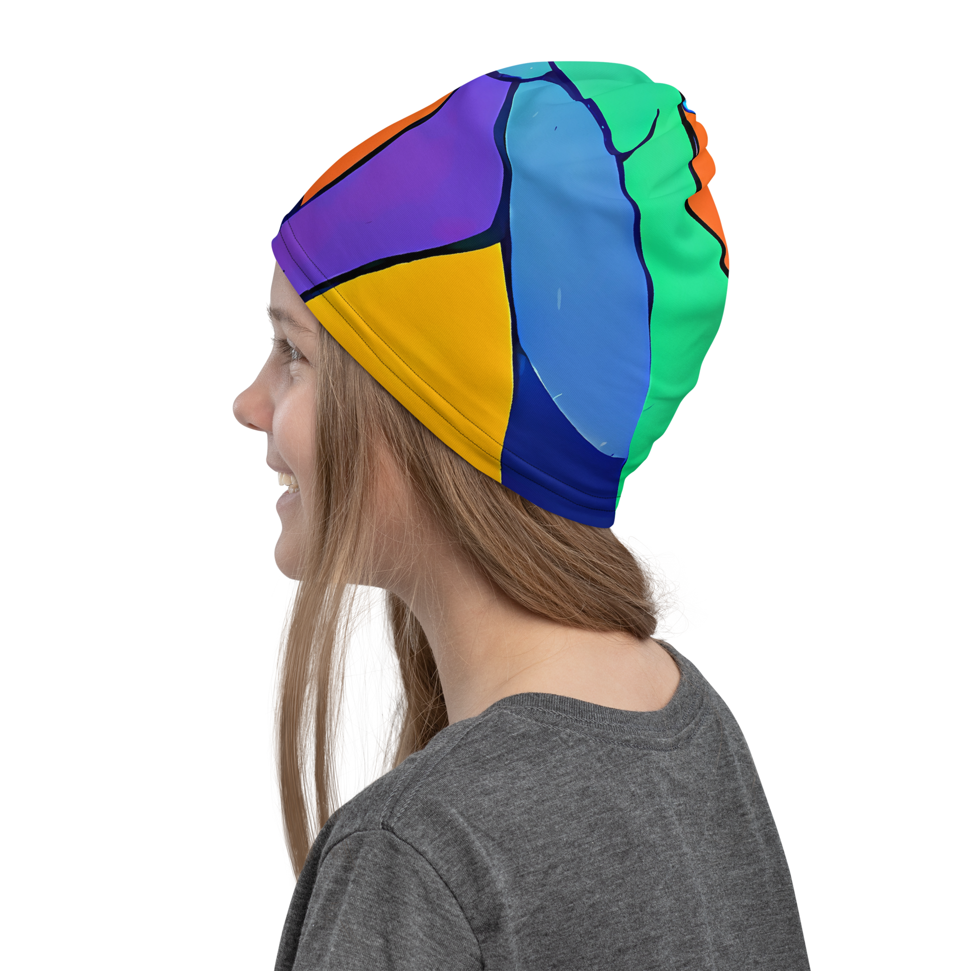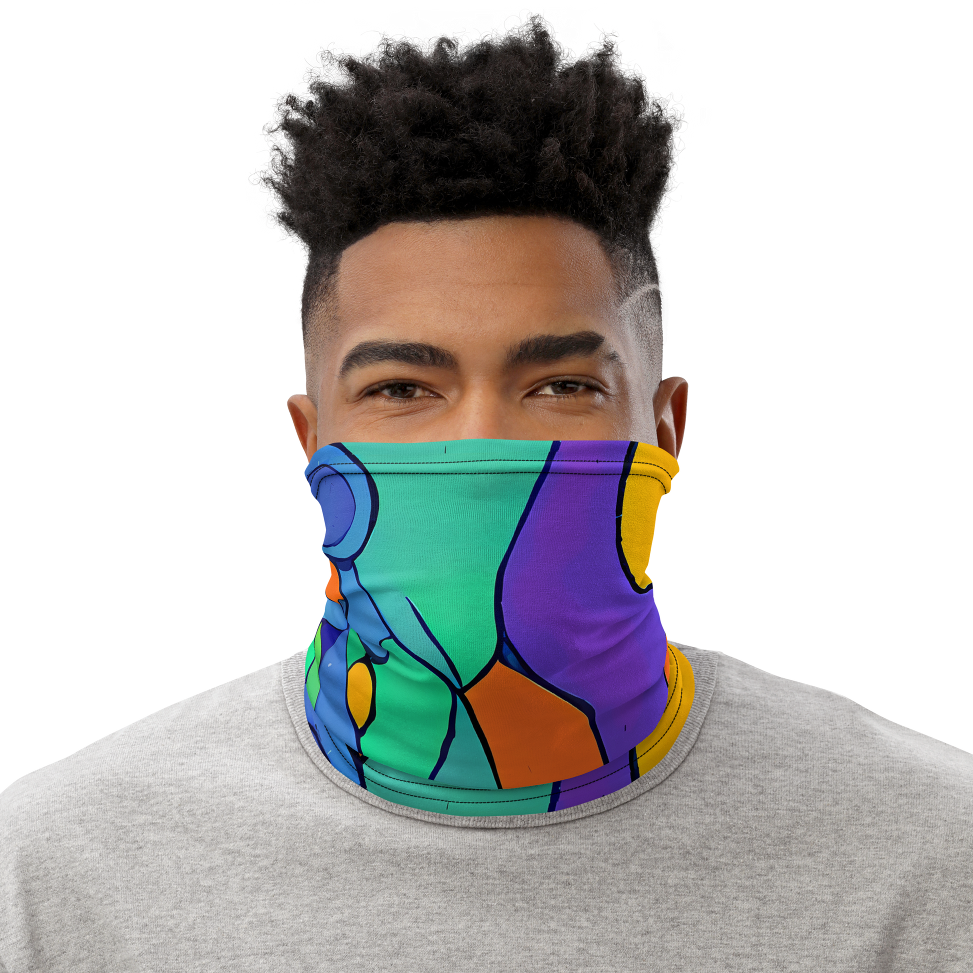 Elevate your accessory game with this stunning neck gaiter, featuring a vibrant tapestry of abstract shapes and bold colors. The dynamic interplay of cobalt blue, fiery orange, and lush green evokes an energetic yet harmonious vibe, perfect for creative gatherings or art events. This versatile accessory can be used as a face covering, headband, bandana, wristband, and neck warmer, making it an ideal addition to your wardrobe for the transitional seasons of spring and autumn.