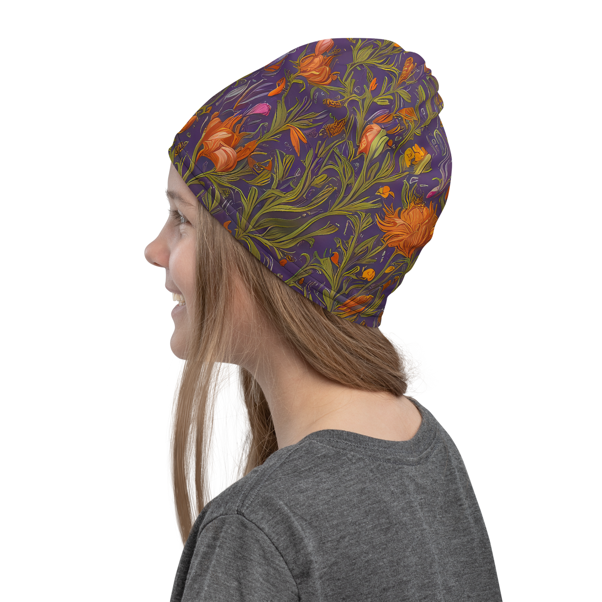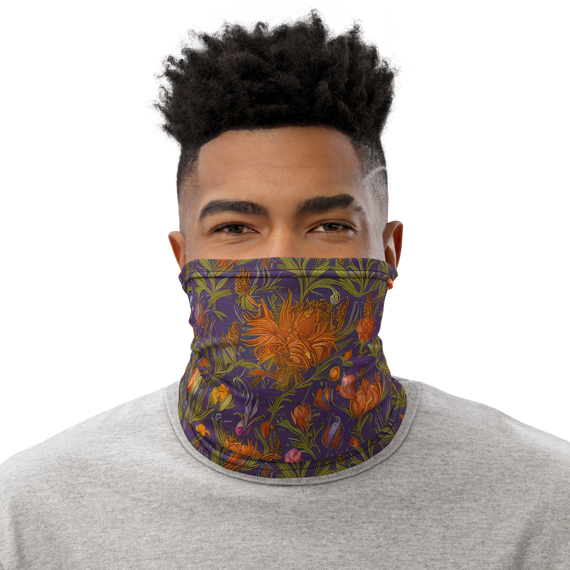 Embrace the fusion of art and the cosmos with our dazzling neck gaiter, a statement piece that transcends the ordinary. Adorned with a captivating array of vibrant blooms in shades of orange, pink, and yellow, harmoniously entwined with verdant foliage against a deep purple canvas, this accessory invites you to carry the majesty of a starlit garden with you. Its rich, detailed design, reminiscent of classical floral masterpieces with a modern, psychedelic touch, makes it a versatile must-have for any event where bold expression and imaginative style converge.