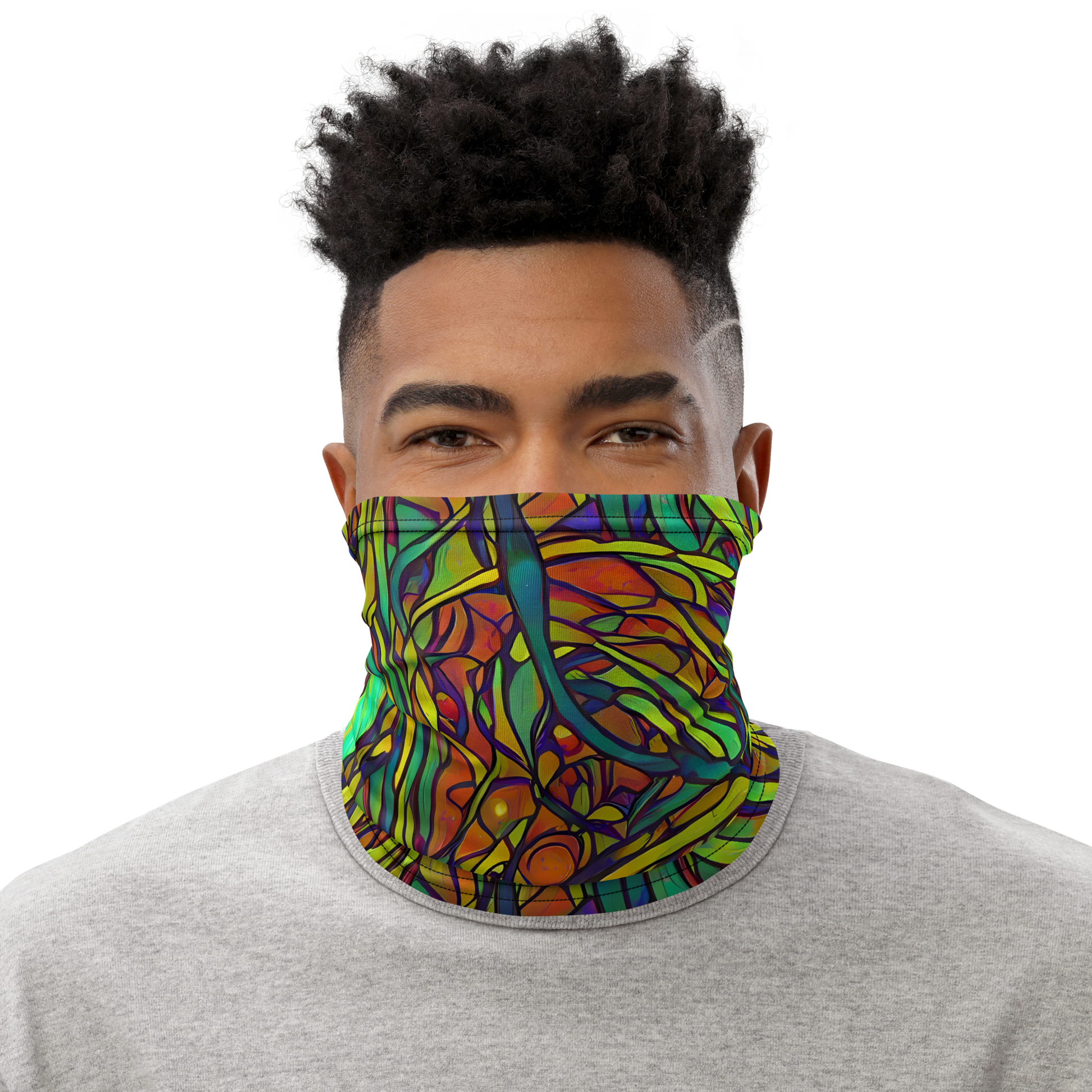 Elevate your style with this versatile neck gaiter, featuring a vibrant tapestry of swirling, organic shapes in electric hues of teal, orange, and lime green. Reminiscent of stained glass artistry, this unique design evokes dynamic movement and otherworldly elegance, making it a bold statement piece for music festivals, art gallery openings, or summer garden parties. Perfect for the creative and adventurous spirit, this accessory brings a touch of cosmic wonder to your wardrobe. Use it as a face covering, headband, bandana, wristband, or neck warmer and upgrade your accessory game with this custom AI-art generated design, printed all-over, custom cut, and handmade by our experts!