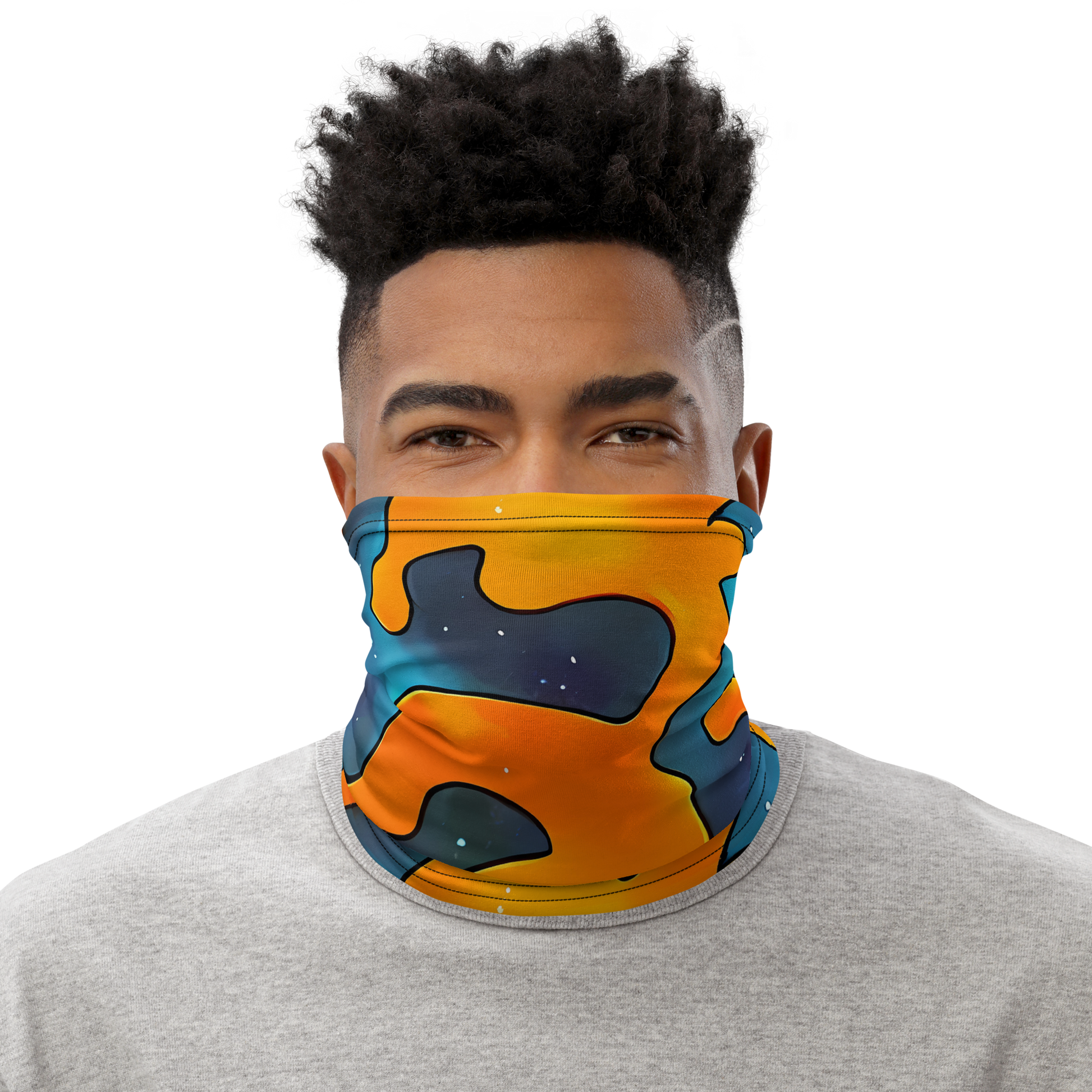 Embrace the cosmic dance of vibrant orange and deep blue with our alluring neck gaiter, a versatile accessory designed to elevate your style to celestial heights. The smooth, glossy finish of the design brings forth a universe of wonder, with amoeba-like shapes that seem to pulse with the energy of the stars themselves. Perfect for the imaginative soul, it's a statement piece for art events, creative gatherings, or to complement the autumnal palette of the season. Experience the fusion of fashion and the infinite cosmos with this unique addition to your wardrobe.