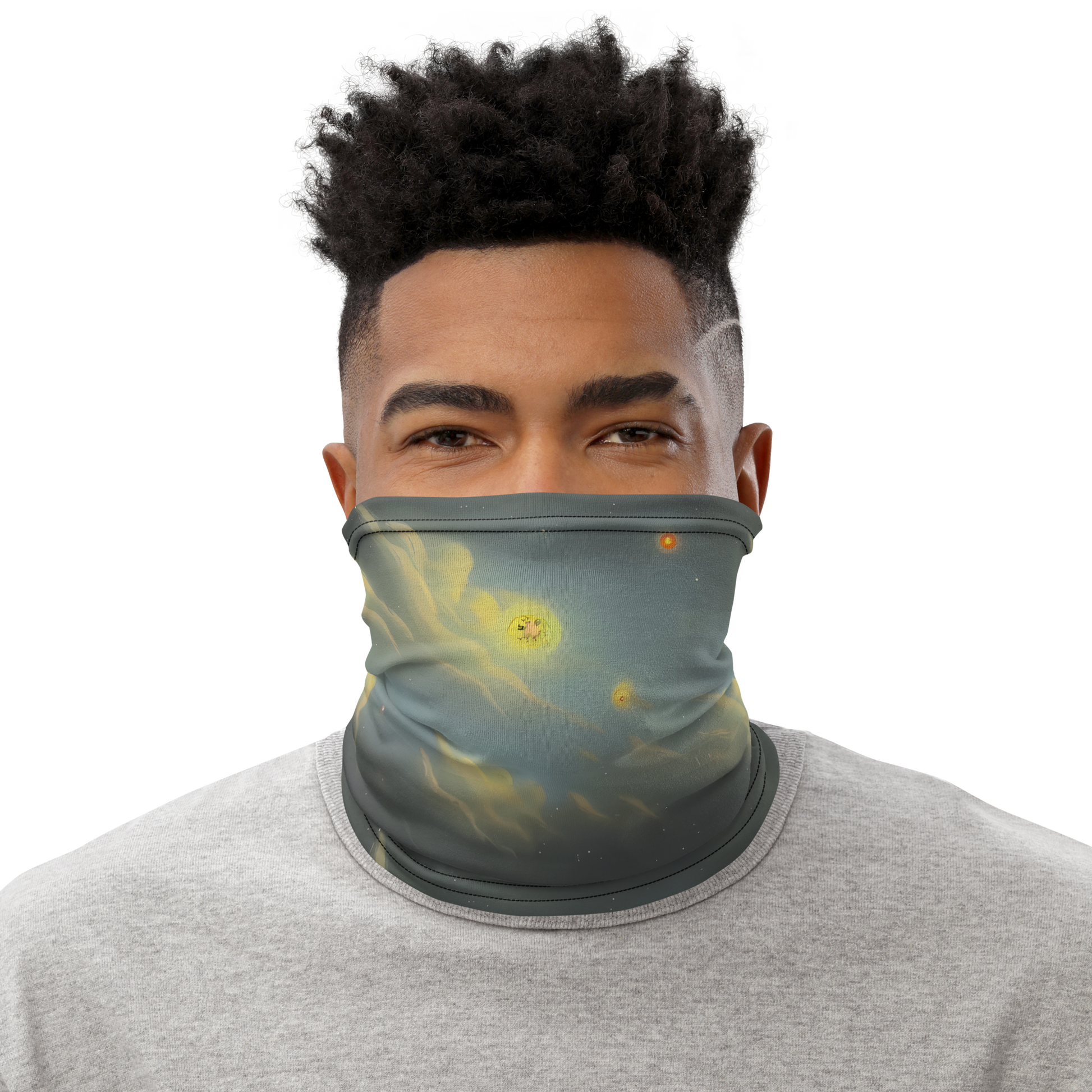 Embrace the cosmos with the "Dreamy Ascent" neck gaiter, a stunning accessory that merges art and functionality. This versatile piece, adorned with a surreal tapestry of swirling celestial clouds and luminous orbs in ethereal greens and glowing yellows, is perfect for the adventurous spirit and the dreamer at heart. Whether you're stargazing on a cool evening or attending an art gallery opening, this gaiter transcends the ordinary and elevates your style. Discover the allure of the universe wrapped around you, while enjoying the practicality of a face covering, headband, bandana, wristband, or neck warmer—all in one.