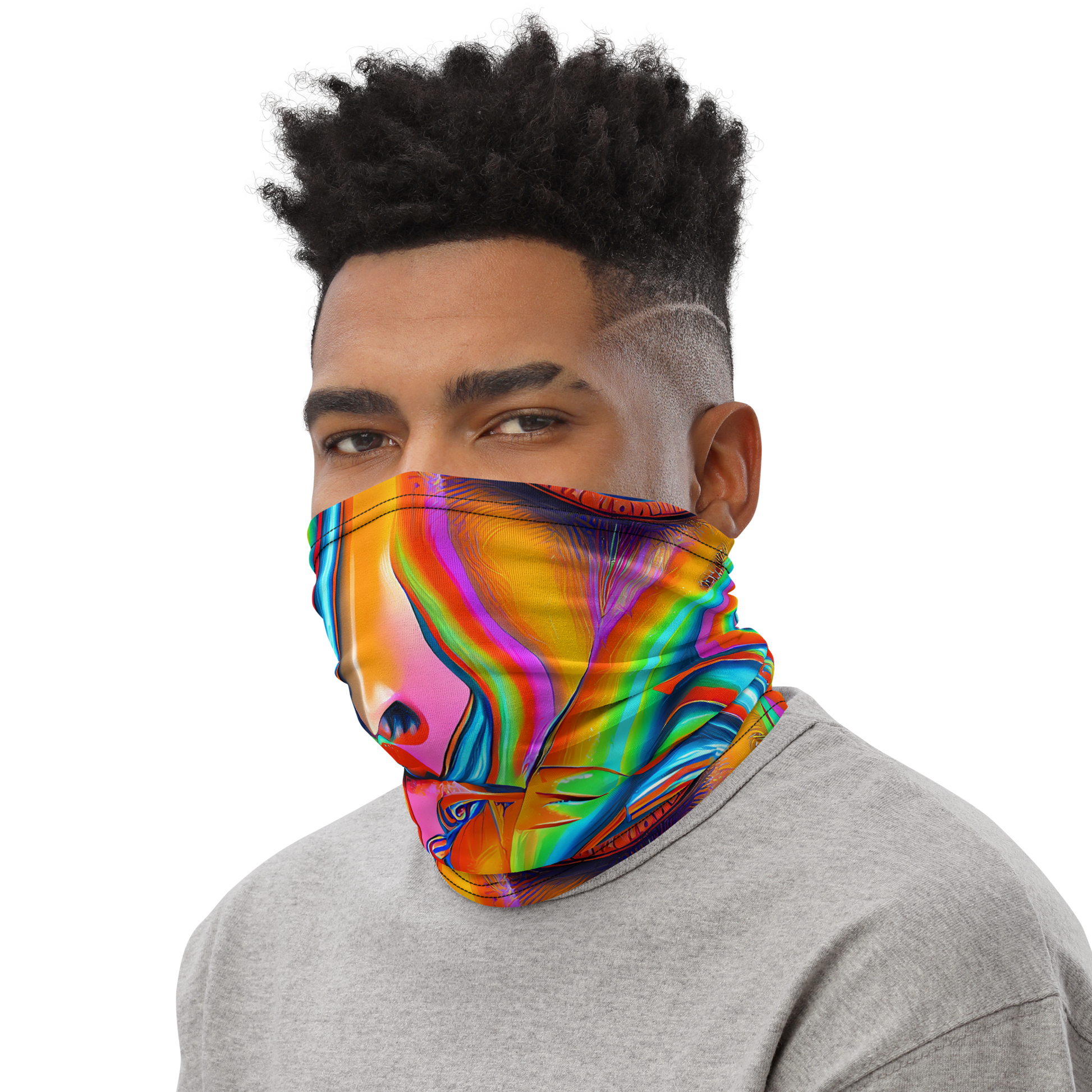 Immerse yourself in the cosmic dance of color and energy with our latest neck gaiter, enveloping you in a mesmerizing blend of electric blues, fiery oranges, and radiant greens. At the heart of this design lies a captivating, piercing gaze, encircled by dynamic, fluid shapes that bring the piece to life, making it a perfect companion for your most daring adventures at music festivals or cutting-edge art scenes. Embrace the spring and summer vibes with this audacious accessory, crafted for the bold, the artistic, and the unique.