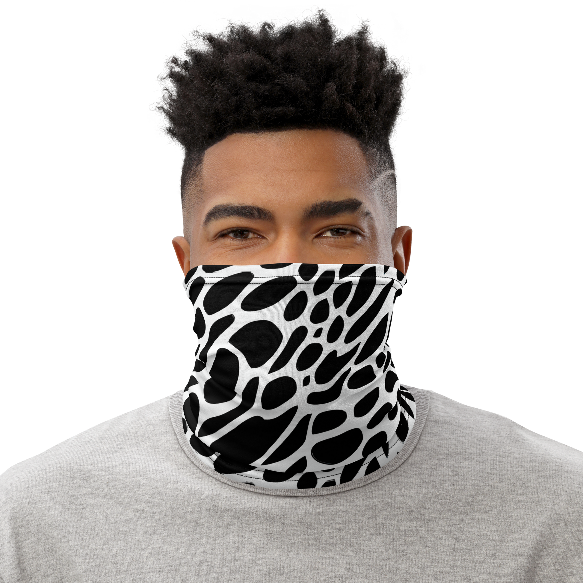 Elevate your style with this versatile neck gaiter, featuring a striking black and white pattern of organic, flowing shapes that evoke bold sophistication and edgy elegance. Perfect for evening events, art gallery openings, and fashion-forward gatherings, this accessory is designed for those who dare to stand out. Made from breathable, four-way stretch fabric, it can be used as a face covering, headband, bandana, wristband, or neck warmer. Upgrade your accessory game with this unique, custom AI-art generated design, printed all-over, custom cut, and handmade by our experts!