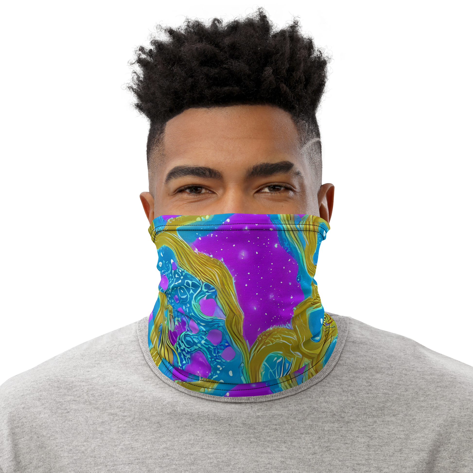 Elevate your style with our "Mystic Waves" Neck Gaiter, a stunning fusion of swirling azure blues, electric purples, and shimmering gold lines. This ethereal design captures the essence of creativity and whimsy, making it the perfect accessory for those who embrace boldness and movement in their fashion. Whether you're at a summer festival or an art gallery event, this versatile neck gaiter is your go-to piece for adding a splash of vibrant color and artistic flair to any outfit.