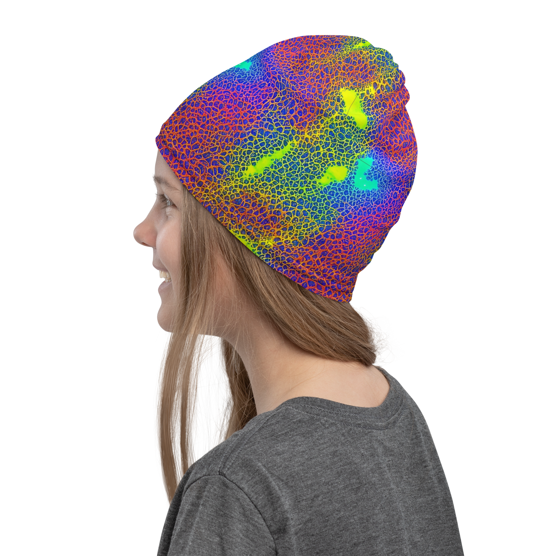 Embrace the vibrance of our electrifying neck gaiter, featuring an all-over print that's a kaleidoscope of neon blues, yellows, and greens set against a deep red-orange backdrop. Its intricate, interlocking shapes are inspired by a psychedelic vision of the microcosm, making it a must-have for those who celebrate individuality with a zest for life. Perfect for music festivals, summer parties, or any occasion that calls for a pop of color, this neck gaiter is designed for the bold and the spirited, ready to complement your unique style at any event.