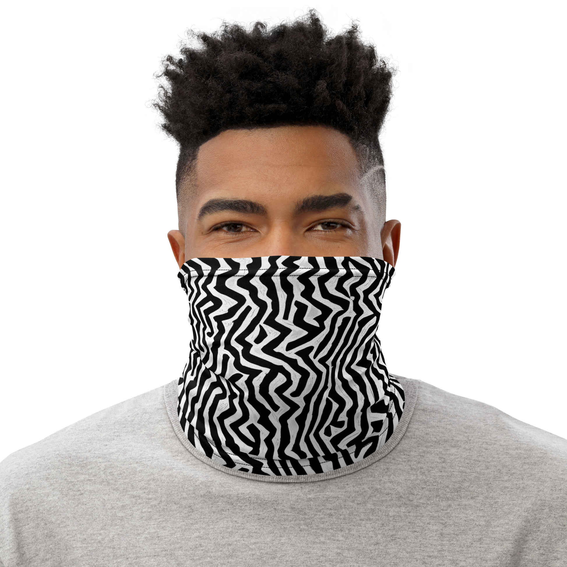 Embrace the electrifying essence of the digital realm with our mesmerizing neck gaiter, featuring a hypnotic maze of black and white jagged lines that capture the raw, unfiltered energy of static on a vintage screen. This high-contrast accessory is not just a functional piece but a bold statement, ideal for those who dare to make an impression at creative gatherings or while exploring the city. Its monochromatic flair is a nod to modern art, making it a must-have for those who embody a dynamic spirit and wish to showcase their unique style in every season.
