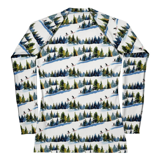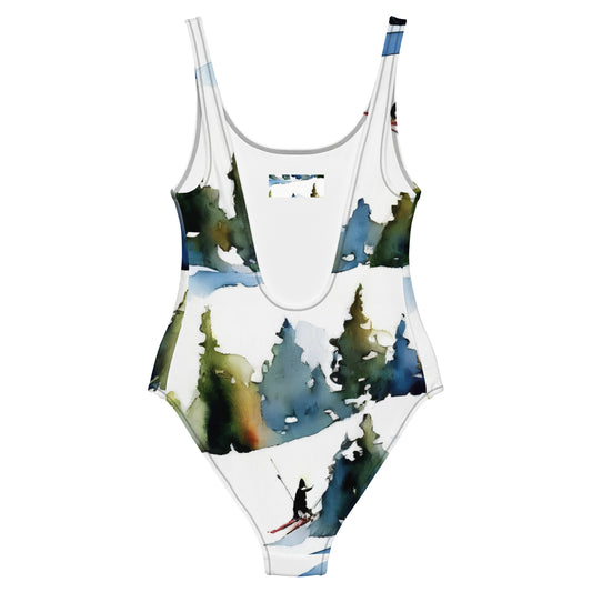 Embrace the spirit of adventure with our "Arctic Escape" one-piece swimsuit, where elegance meets playful whimsy. Featuring a stunning watercolor design of skiers weaving through lush, evergreen forests under a serene winter sky, this swimsuit is perfect for those who love to make a statement. Crafted from chlorine-resistant fabric, it combines style and durability, ensuring you shine whether you're lounging by the pool or enjoying après-ski gatherings. Stand out with a cheeky fit, scoop neckline, and low scoop back that beautifully accentuate your silhouette, making every splash a stylish one.