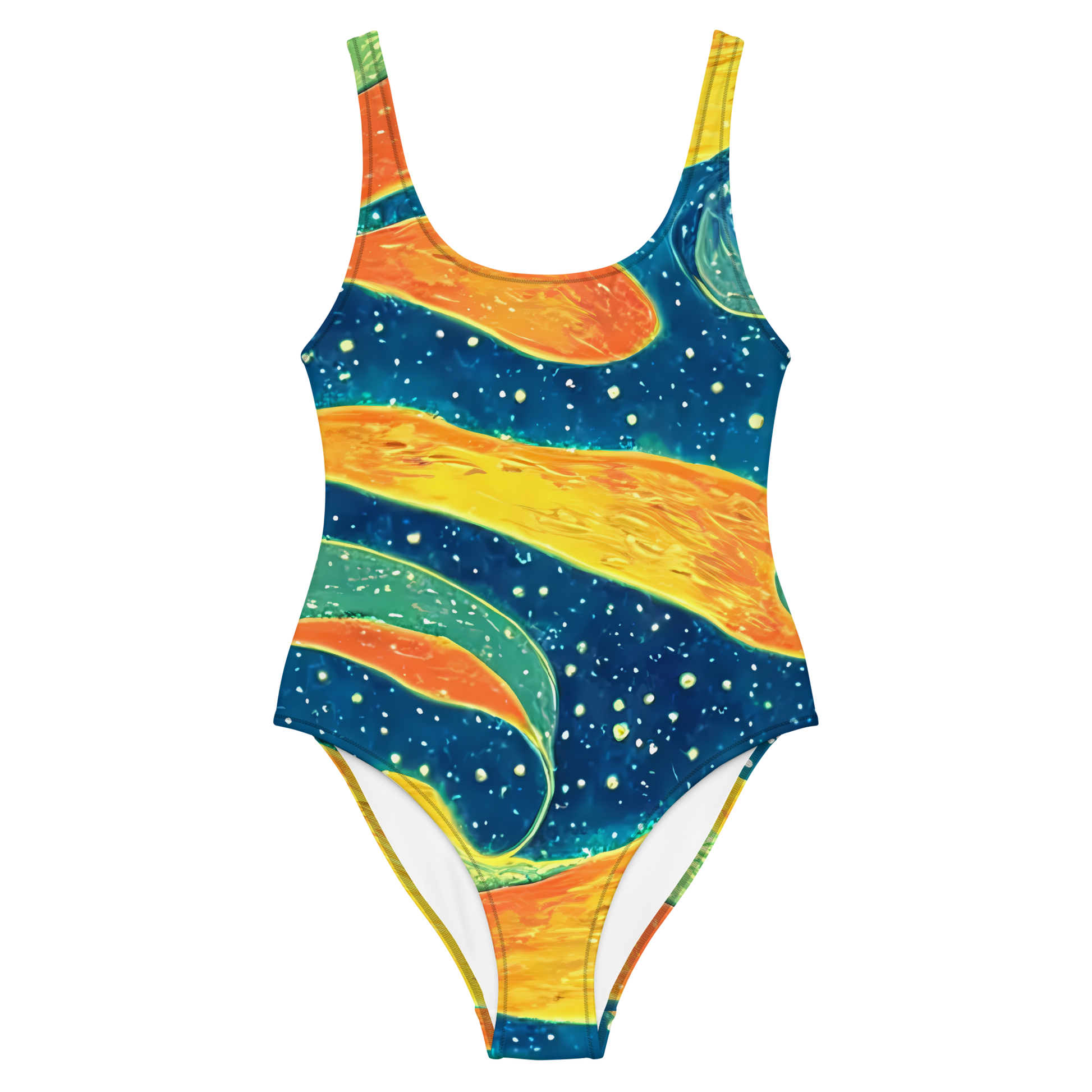 "Celestial Harmony" is an evocative tapestry of swirling oranges, yellows, and greens against a deep cosmic blue, reminiscent of a starry night sky. The flowing, abstract shapes create a sense of movement and wonder, evoking emotions of adventure and creativity. Perfect for art gallery openings or summer festivals, this pattern suits a free-spirited personality and adds a touch of celestial magic to any wardrobe.