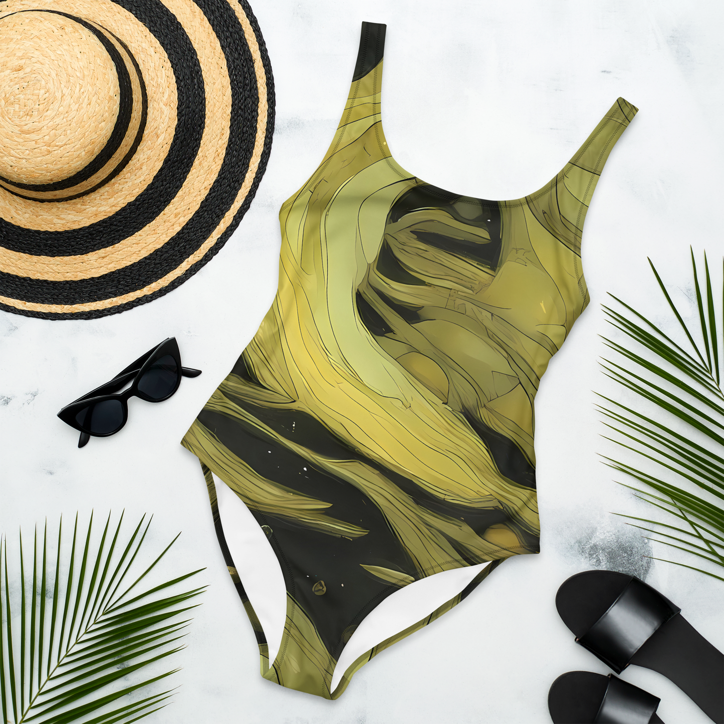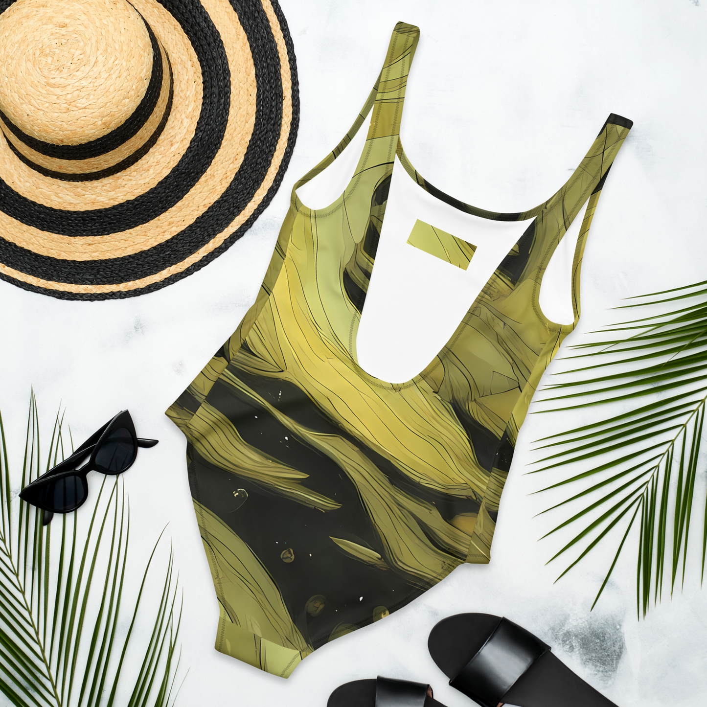 Immerse yourself in a celestial dance of style with our "Whispered Breeze" one-piece swimsuit, where golden swirls pirouette across a mysterious cosmic black canvas. This piece, reminiscent of Andrew Wyeth's dreamy landscapes with a psychedelic spin, offers a touch of autumnal elegance for the contemplative spirit. Dive into the depths of fashion with a statement that whispers sophistication with every wave.