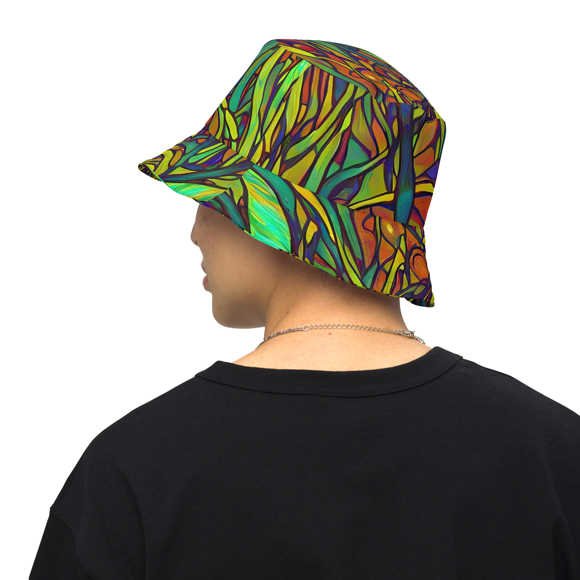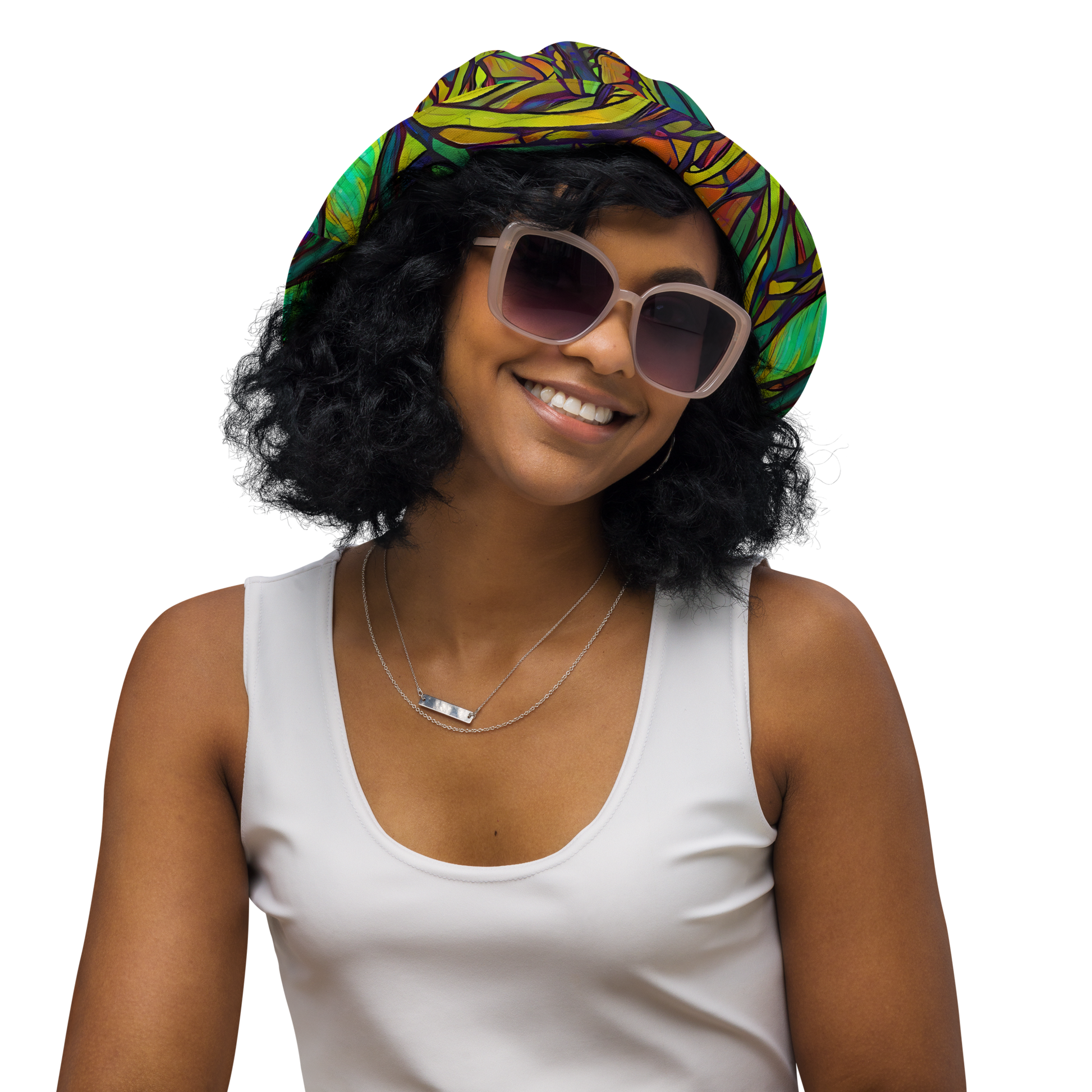 Elevate your streetwear game with this stunning reversible bucket hat, featuring a vibrant tapestry of swirling, organic shapes in electric hues of teal, orange, and lime green. This design, reminiscent of stained glass artistry, evokes dynamic movement and otherworldly elegance, perfect for making a bold statement at music festivals, art gallery openings, or summer garden parties. Made of breathable premium fabric, this hat will become your go-to accessory for any lively spring and summer occasion.