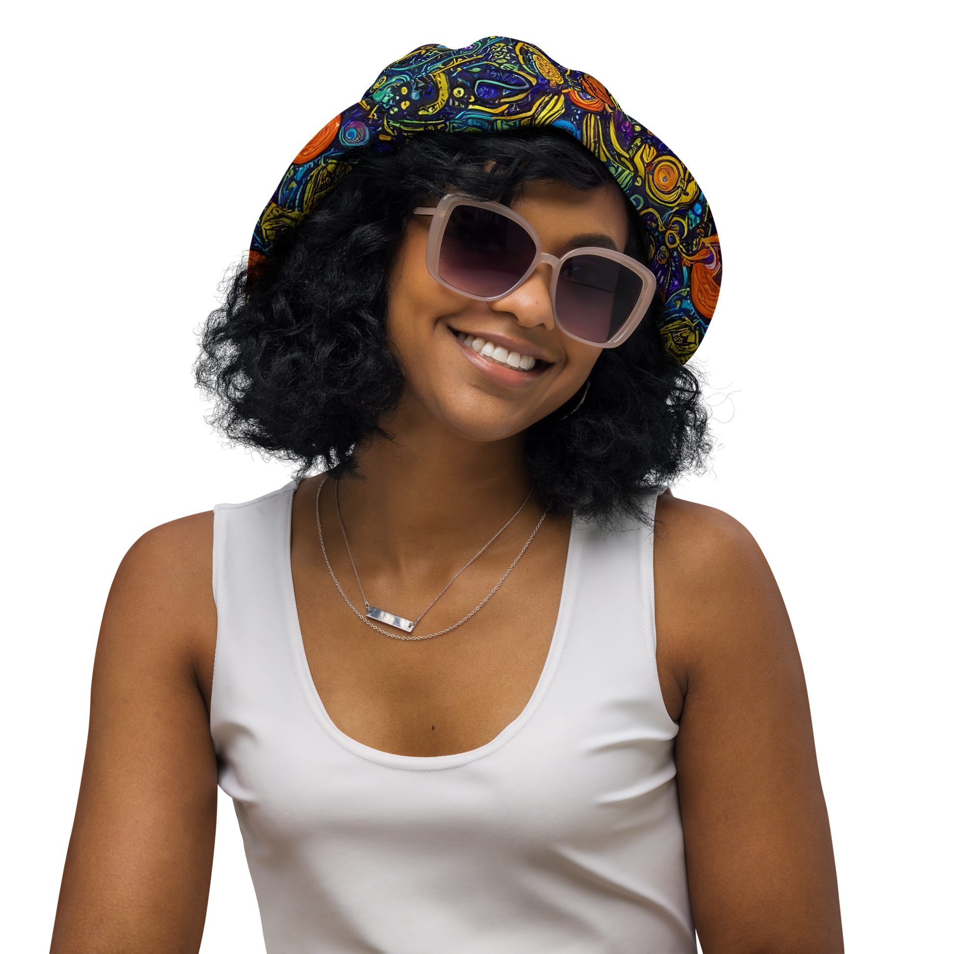 Embark on an interstellar fashion journey with our Reversible Bucket Hat, adorned with a mesmerizing pattern that captures the essence of the cosmos. This hat features a vibrant tapestry of swirling cosmic motifs, with a kaleidoscope of rich blues, radiant oranges, and luminous yellows that transport you to a mystical, otherworldly realm. Perfect for those who dare to stand out, this hat is a statement piece for creative souls and festival goers, offering a versatile accessory for any season. Flip it to match your mood or outfit, enjoying two unique styles in one with this breathable, premium fabric hat that promises to be your new favorite streetwear essential.