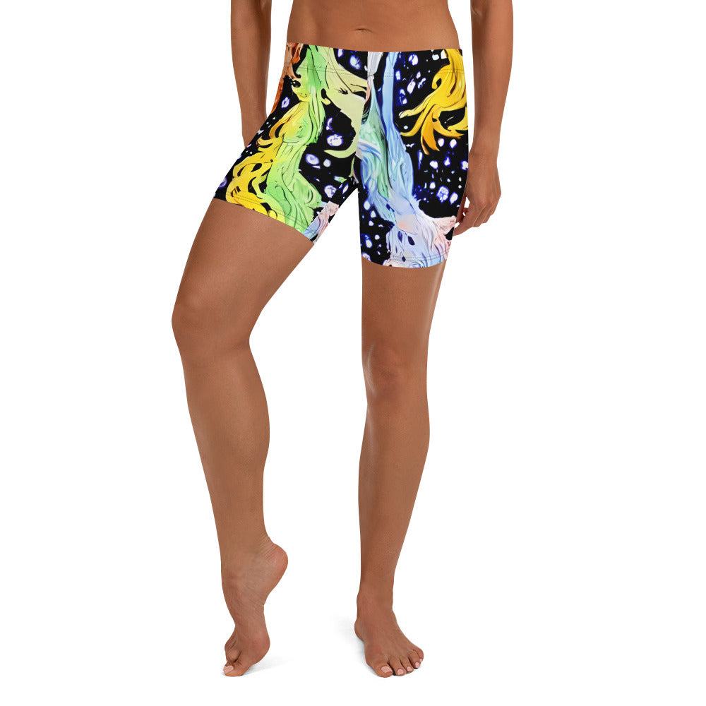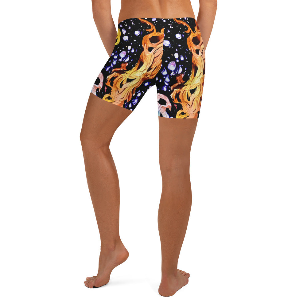 Step into a world of vibrant artistry with our "Celestial Serenade" shorts, where fiery oranges, serene yellows, and tranquil greens swirl together against a star-speckled night sky. Designed for those who dare to stand out, these shorts embody a baroque sensibility that effortlessly transitions from the gym to art galas. Experience the perfect blend of style and comfort, making every move a statement.