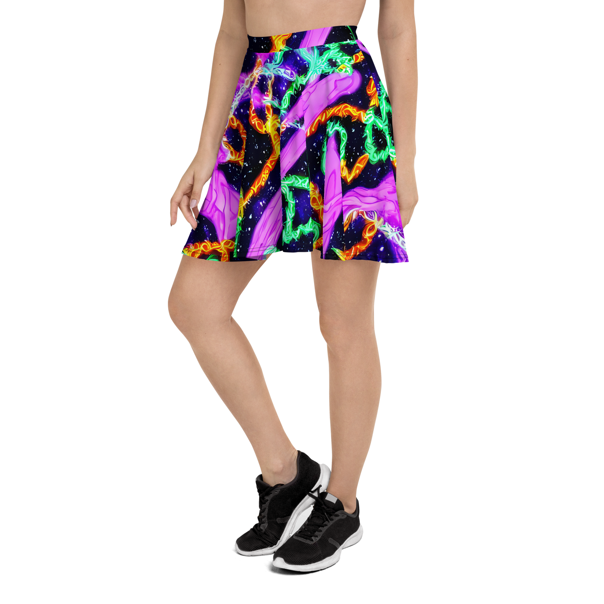 Embrace the cosmic allure of our latest skater skirt, a sartorial tribute to the ethereal realms of space. The skirt's vibrant pattern swirls with neon greens, purples, and oranges set against a starry deep blue canvas, capturing the mystical wonder of the night sky. Ideal for those seeking to express their bold creativity and romantic spirit, this skirt is your perfect companion for summer festivals under the celestial dome.