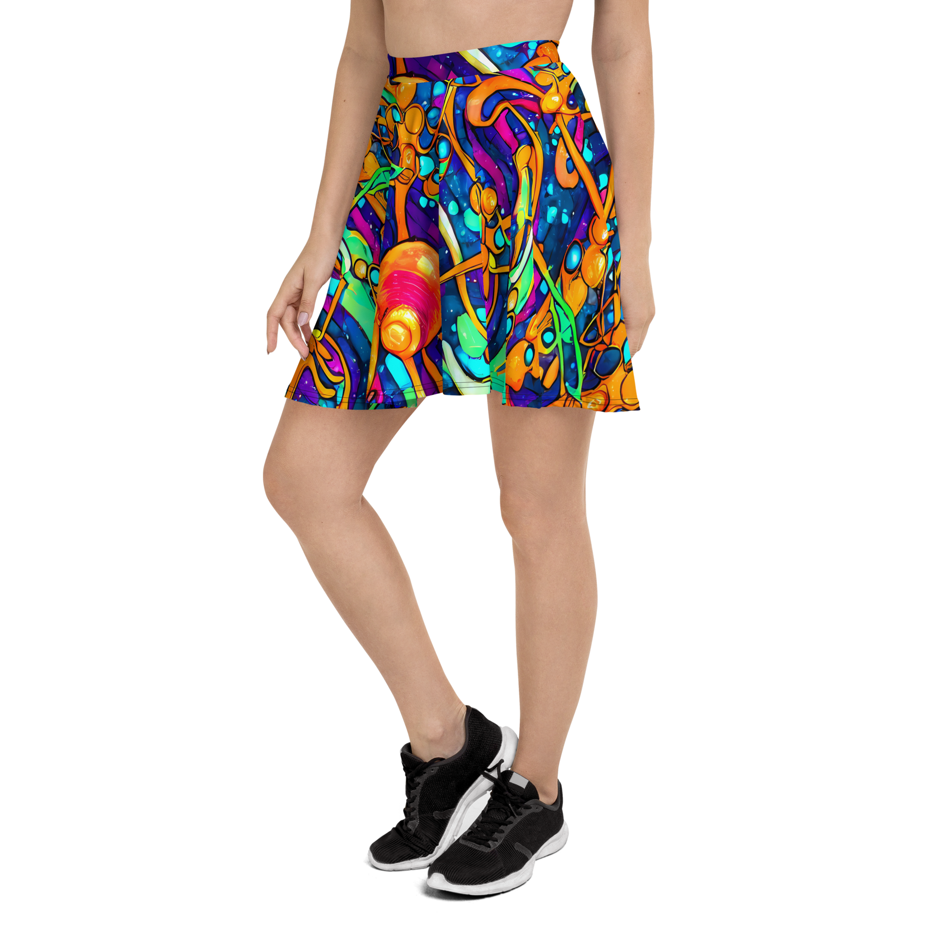 Unleash your inner cosmic goddess with our Skater Skirt in the exclusive "Iridescent Nebula" pattern. This vibrant masterpiece combines electric blues, vivid oranges, and luminous greens with graffiti-like tendrils, creating a mesmerizing, liquid-like texture that dances with every move. Perfect for standing out at music festivals or avant-garde art events, this skirt is a statement piece that promises to captivate and inspire.