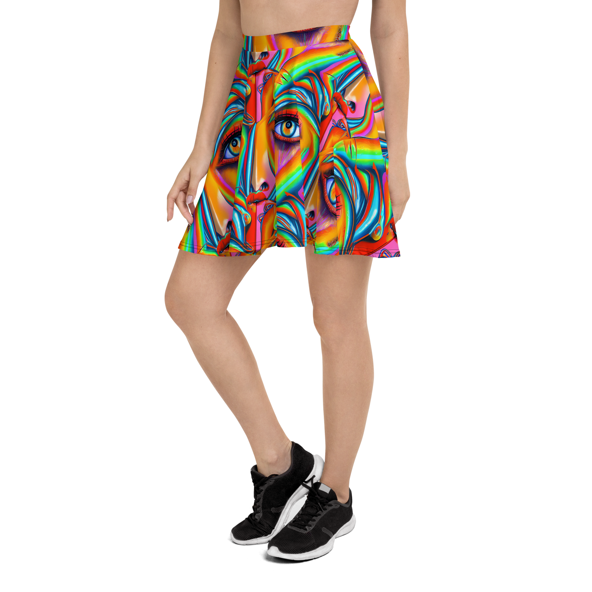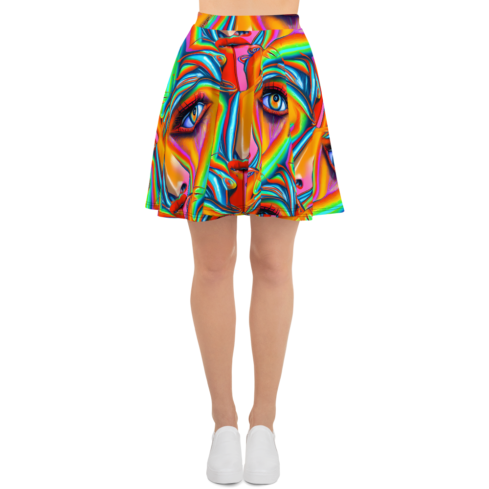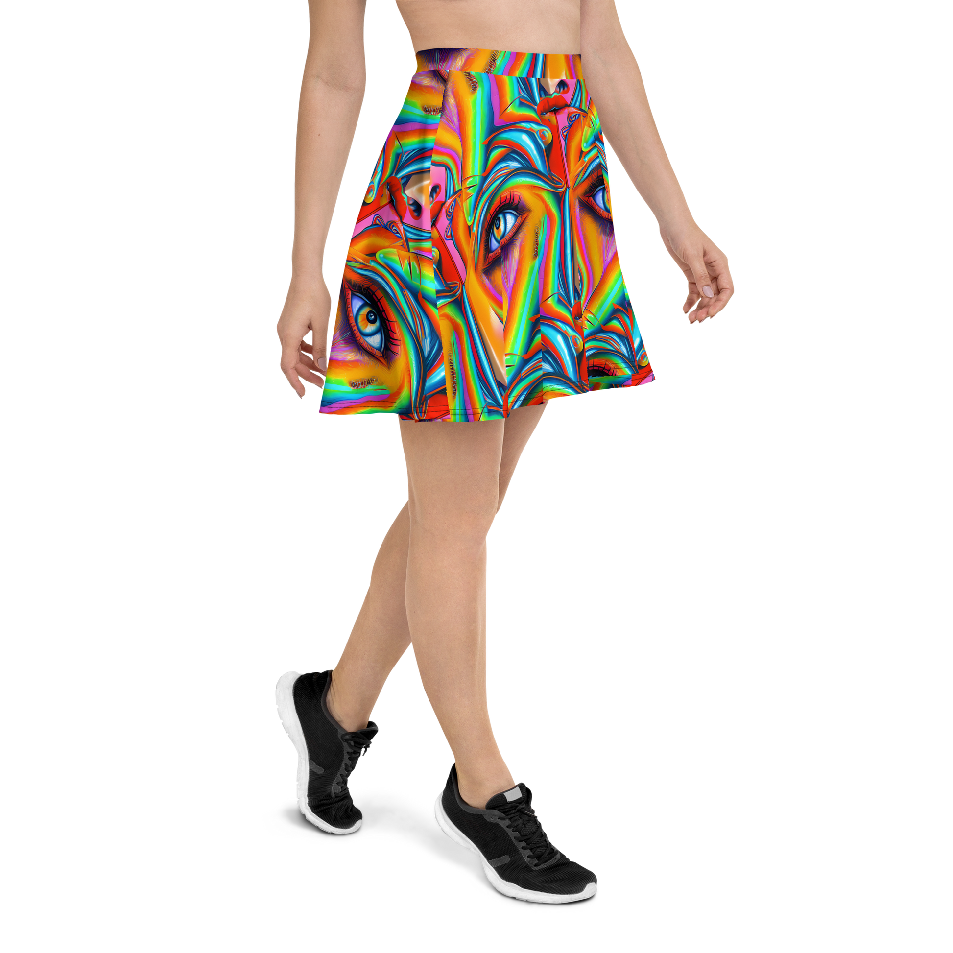 Ignite your wardrobe with our mesmerizing skater skirt, featuring the electrifying "Kaleidovisions" pattern. A dynamic display of electric blues, fiery oranges, and luminous greens dance across the fabric in a hypnotic fusion that captures the eye and imagination. At the heart of the design, a captivating eye draws you into a world of abstract artistry and motion – a true statement piece for those who dare to stand out at any festive gathering or art event.