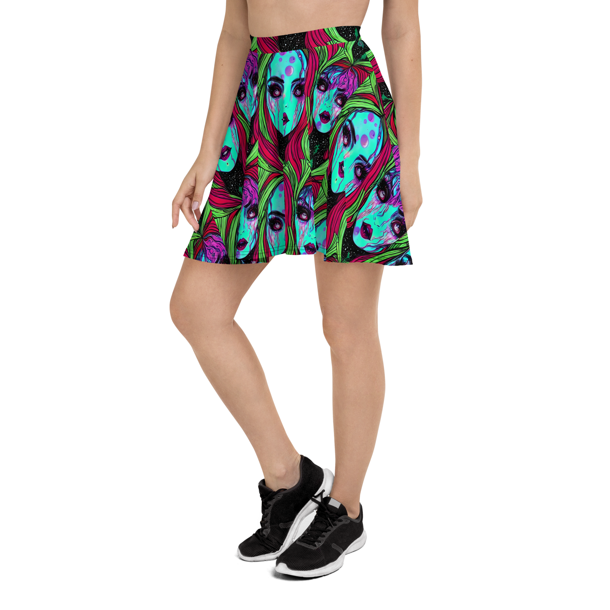 Step into a world of vibrant self-expression with our "Luminous Nightfall" skater skirt, a masterpiece of cosmic allure and artistic flair. This electrifying design, with its vivid turquoise, magenta, and neon green hues interwoven with cosmic black and ethereal purple, is perfect for those who dare to stand out. Ideal for cooler seasons, this skirt's surreal faces and flowing lines make it a must-have for avant-garde events or nightlife adventures in urban settings. Let your imagination soar with every twirl!