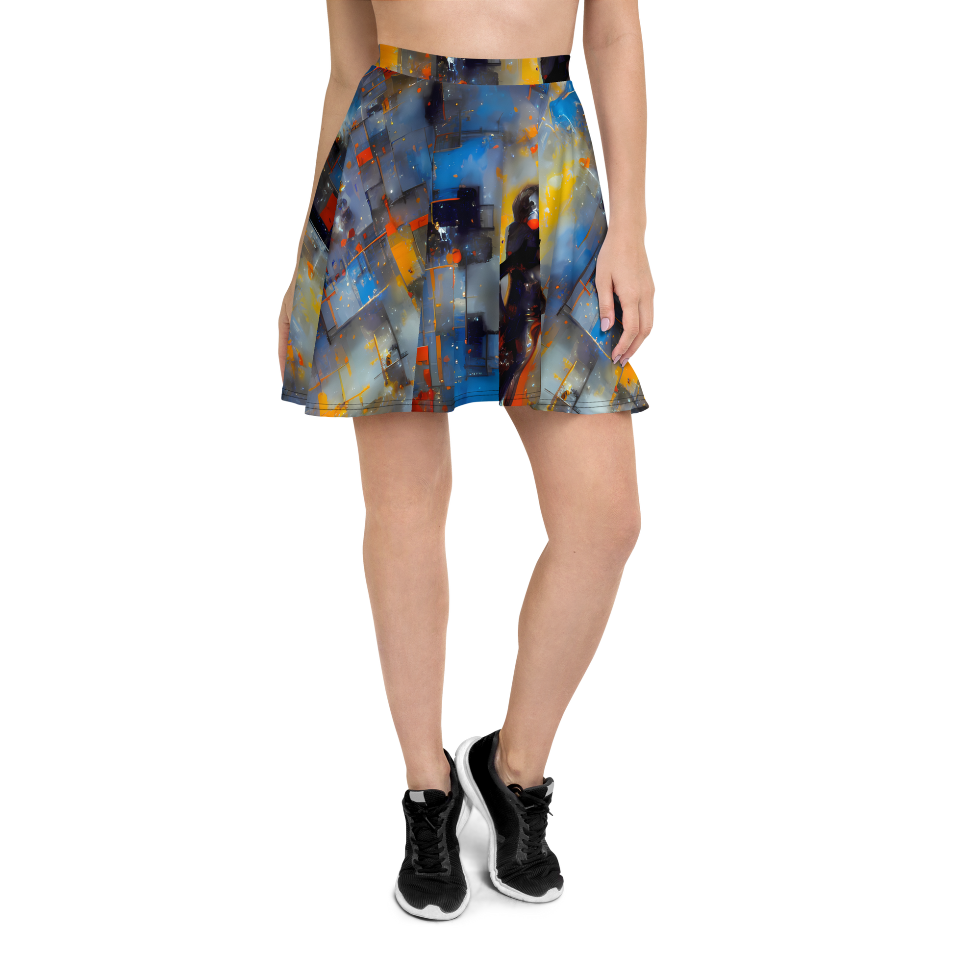 Step into the spotlight with our eye-catching skater skirt, where art meets apparel in a dance of color and form. Embrace the fusion of bold primary colors and abstract geometric lines, with a pattern that channels the spirit of iconic art movements and the mysteries of the cosmos. This skirt is a canvas of expression, featuring bursts of softer hues and subtle gradients that make it a versatile choice for any occasion where you want to showcase your individuality and flair.