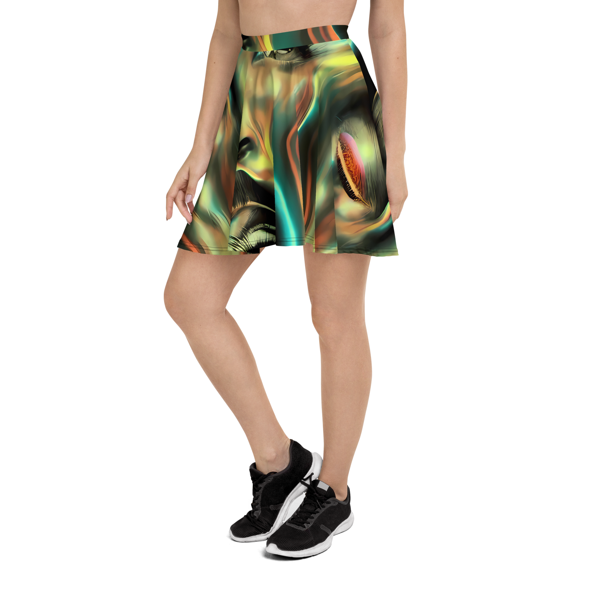 Embrace the enigma of artistry with our skater skirt, featuring a mesmerizing blend of abstract and realism. The swirling teal, orange, and golden hues dance with ethereal facial impressions, creating a garment that is a walking gallery of sophistication and mystery. Perfect for those who command attention and appreciate the fusion of classical artistry with modern flair, this skirt is a statement piece for all seasons.