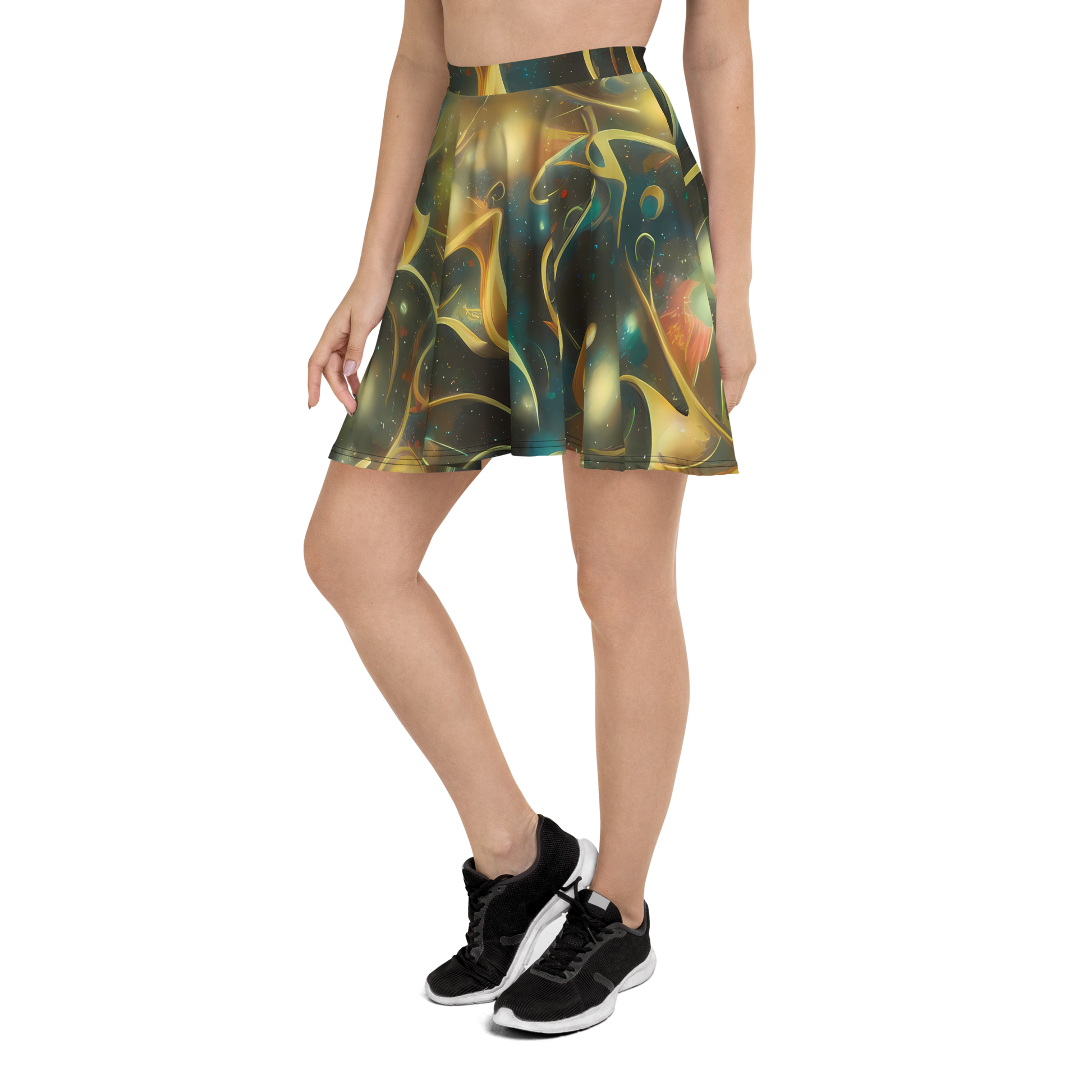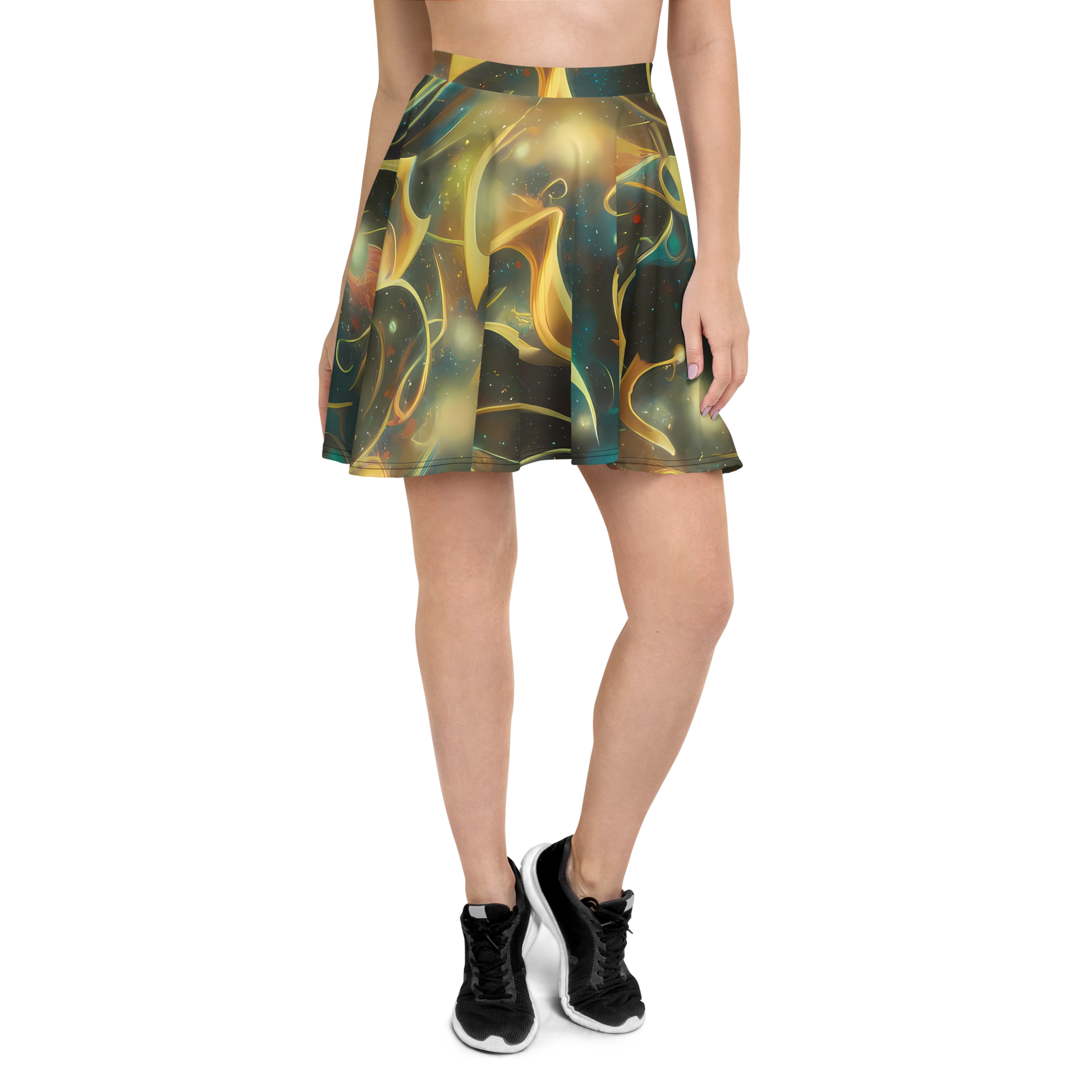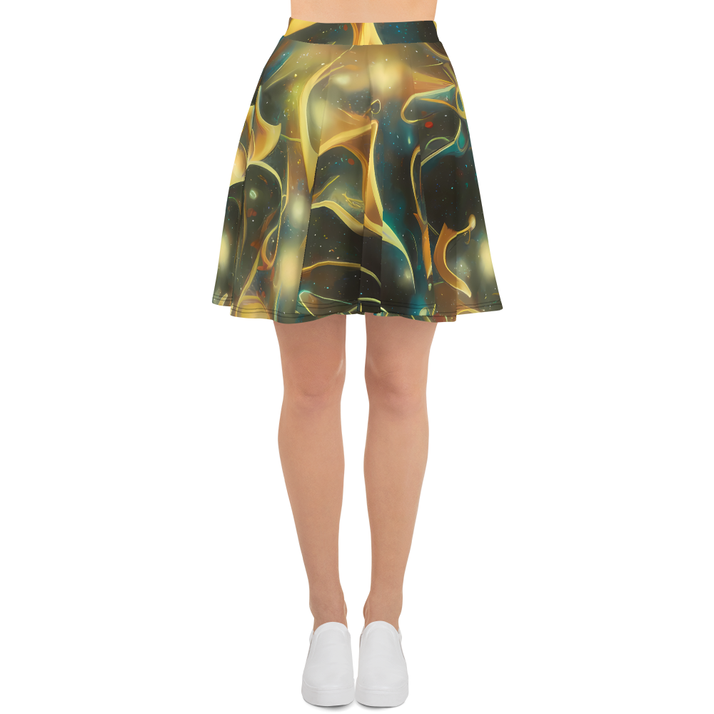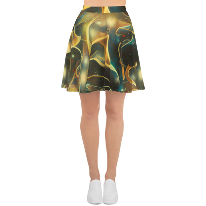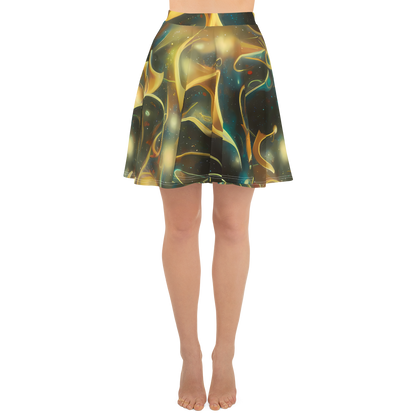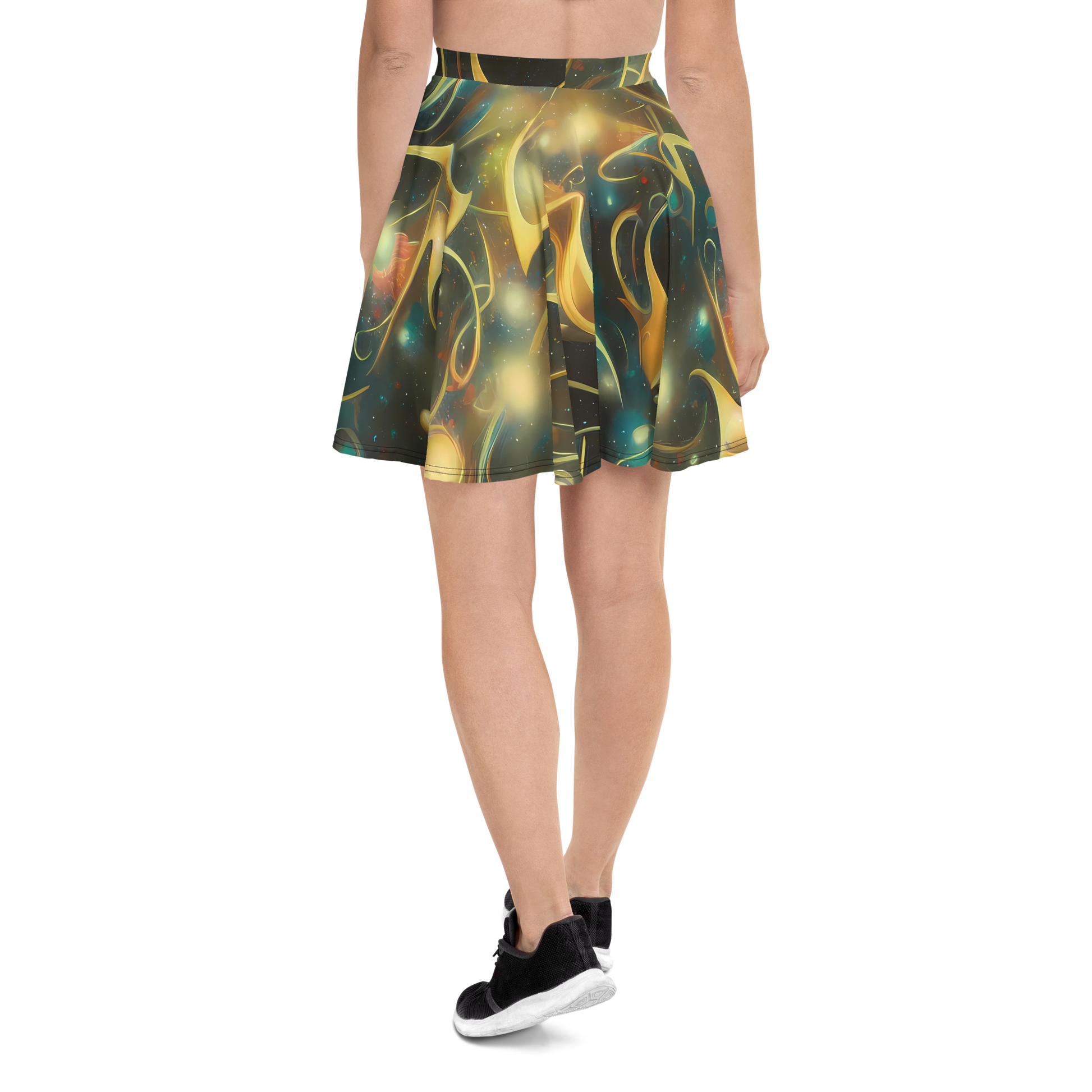Step into the cosmos with our "Whispering Galaxies" skater skirt, a sartorial tribute to the stars. Draped in a pattern of golden swirls and celestial shapes set against a mysterious cosmic canvas, this skirt is a luxurious nod to the artistry of Brad Kunkle and the boldness of Kaws. Perfect for those who seek to express their love for the night sky with an avant-garde twist, it's a must-have for your autumn and winter wardrobe, ensuring you shine at every chic gathering or night out.