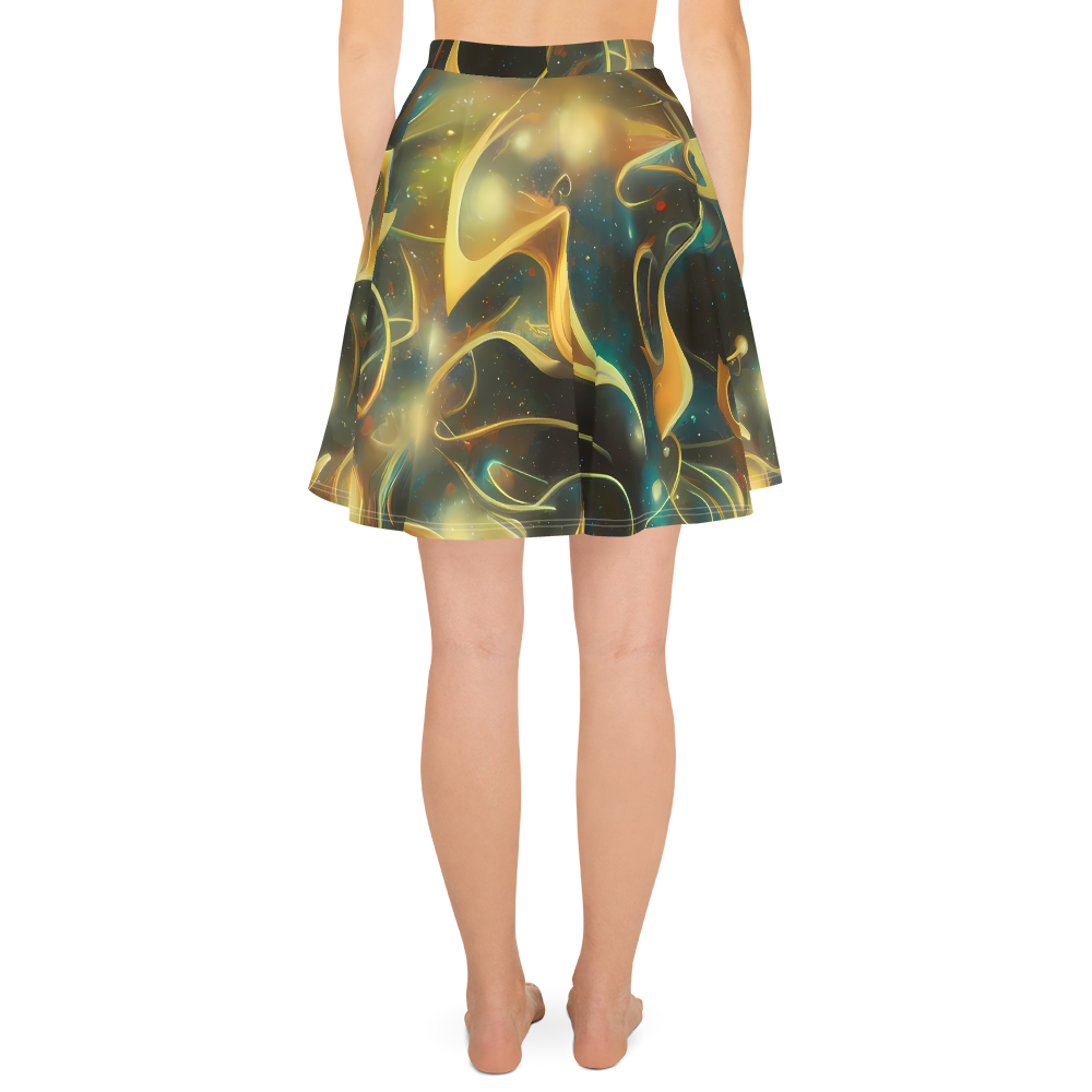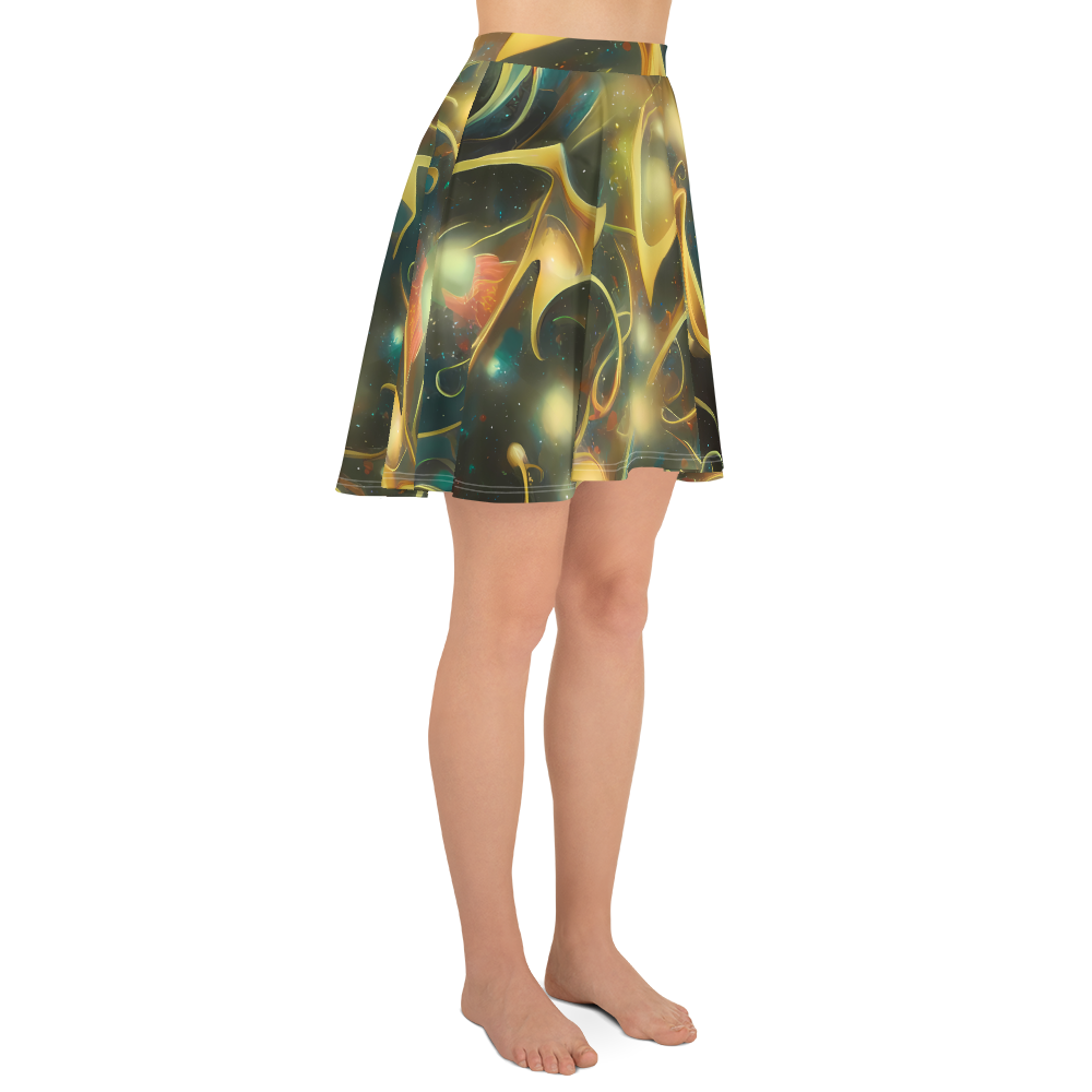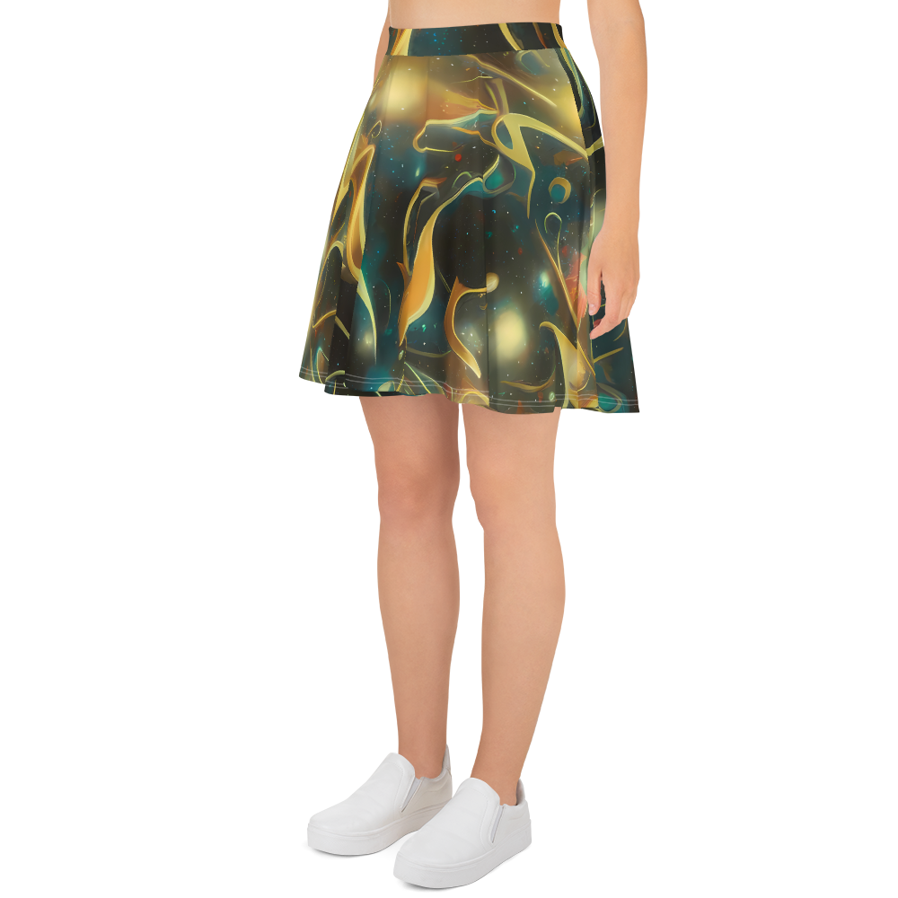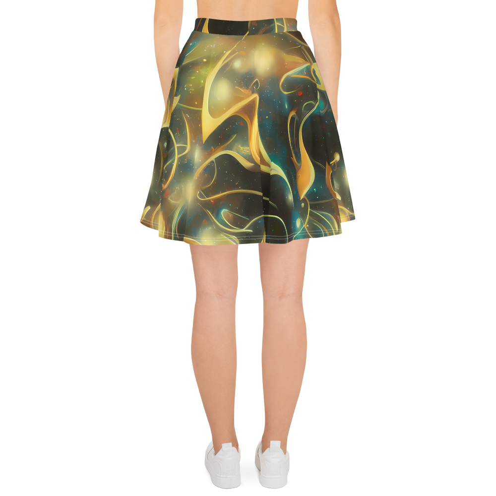 Step into the cosmos with our "Whispering Galaxies" skater skirt, a sartorial tribute to the stars. Draped in a pattern of golden swirls and celestial shapes set against a mysterious cosmic canvas, this skirt is a luxurious nod to the artistry of Brad Kunkle and the boldness of Kaws. Perfect for those who seek to express their love for the night sky with an avant-garde twist, it's a must-have for your autumn and winter wardrobe, ensuring you shine at every chic gathering or night out.