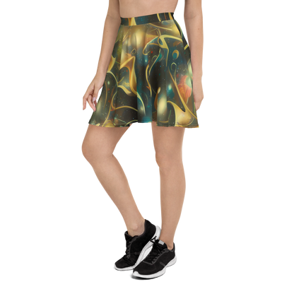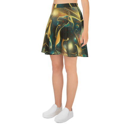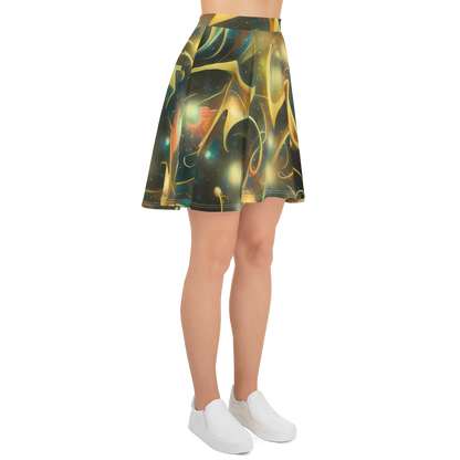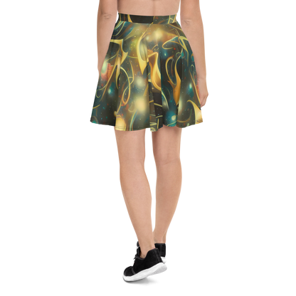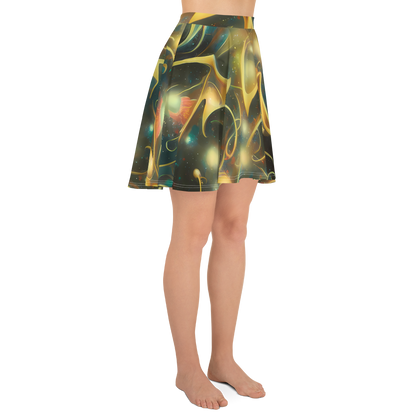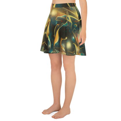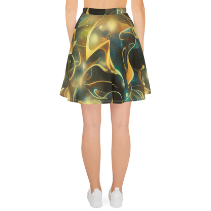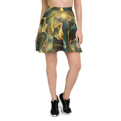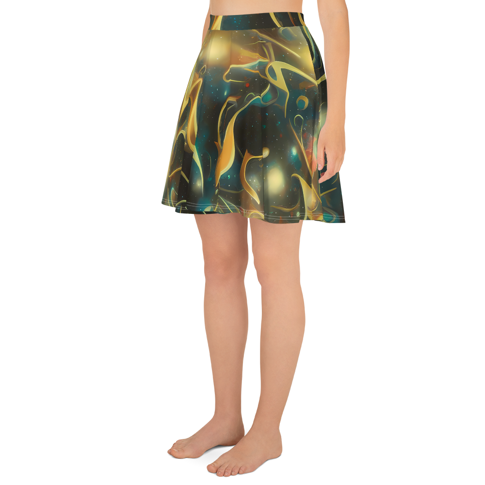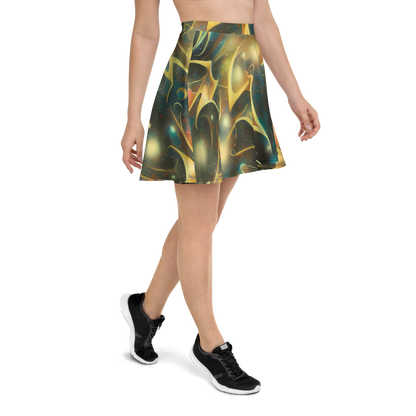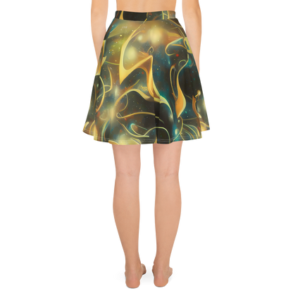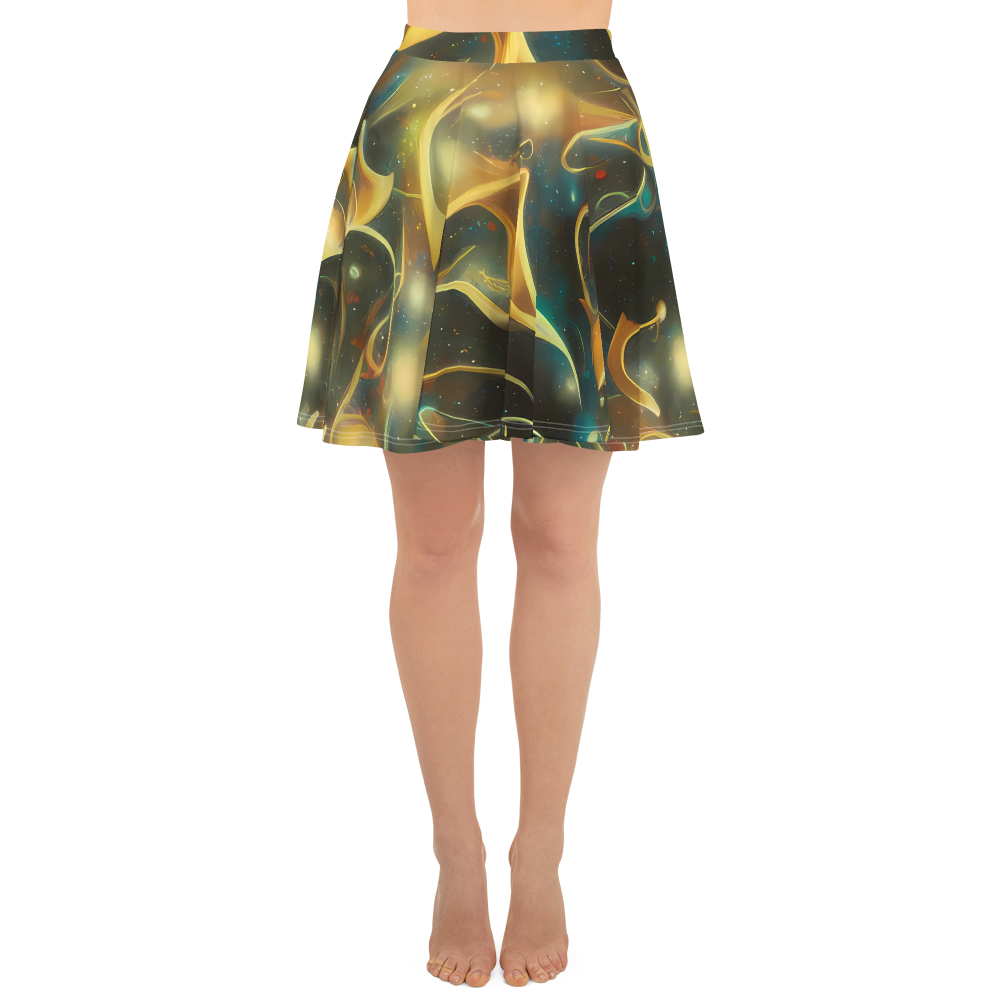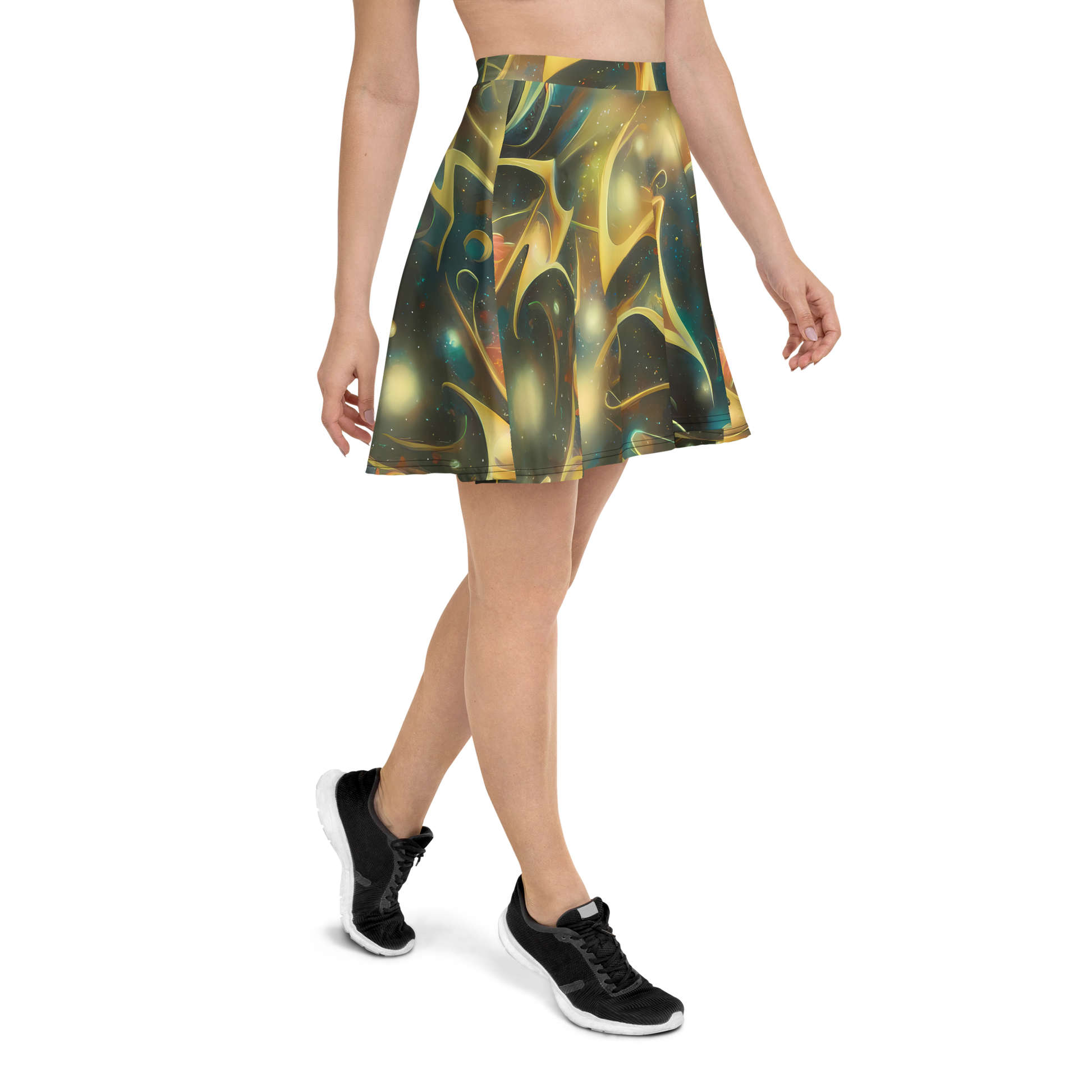 Step into the cosmos with our "Whispering Galaxies" skater skirt, a sartorial tribute to the stars. Draped in a pattern of golden swirls and celestial shapes set against a mysterious cosmic canvas, this skirt is a luxurious nod to the artistry of Brad Kunkle and the boldness of Kaws. Perfect for those who seek to express their love for the night sky with an avant-garde twist, it's a must-have for your autumn and winter wardrobe, ensuring you shine at every chic gathering or night out.