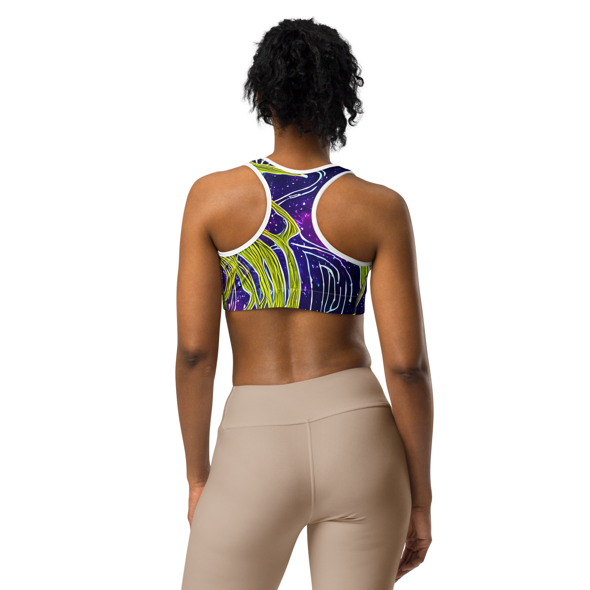 Unleash your cosmic energy with our "Celestial Scribbles" sports bra, where vibrant artistry meets ultimate performance! This eye-catching design features swirling neon green lines against a mesmerizing deep purple and blue night sky, inspired by the avant-garde creativity of Adolf Wölfli. Perfect for those who dare to stand out, this sports bra combines style and functionality, ensuring you feel as good as you look during every workout.