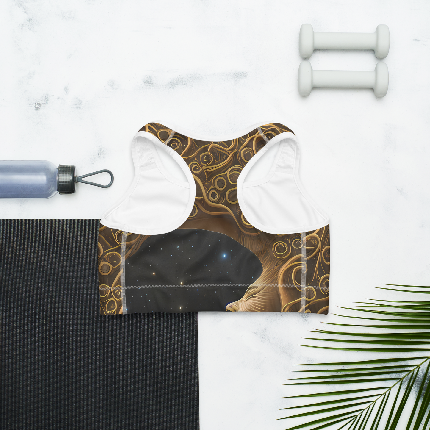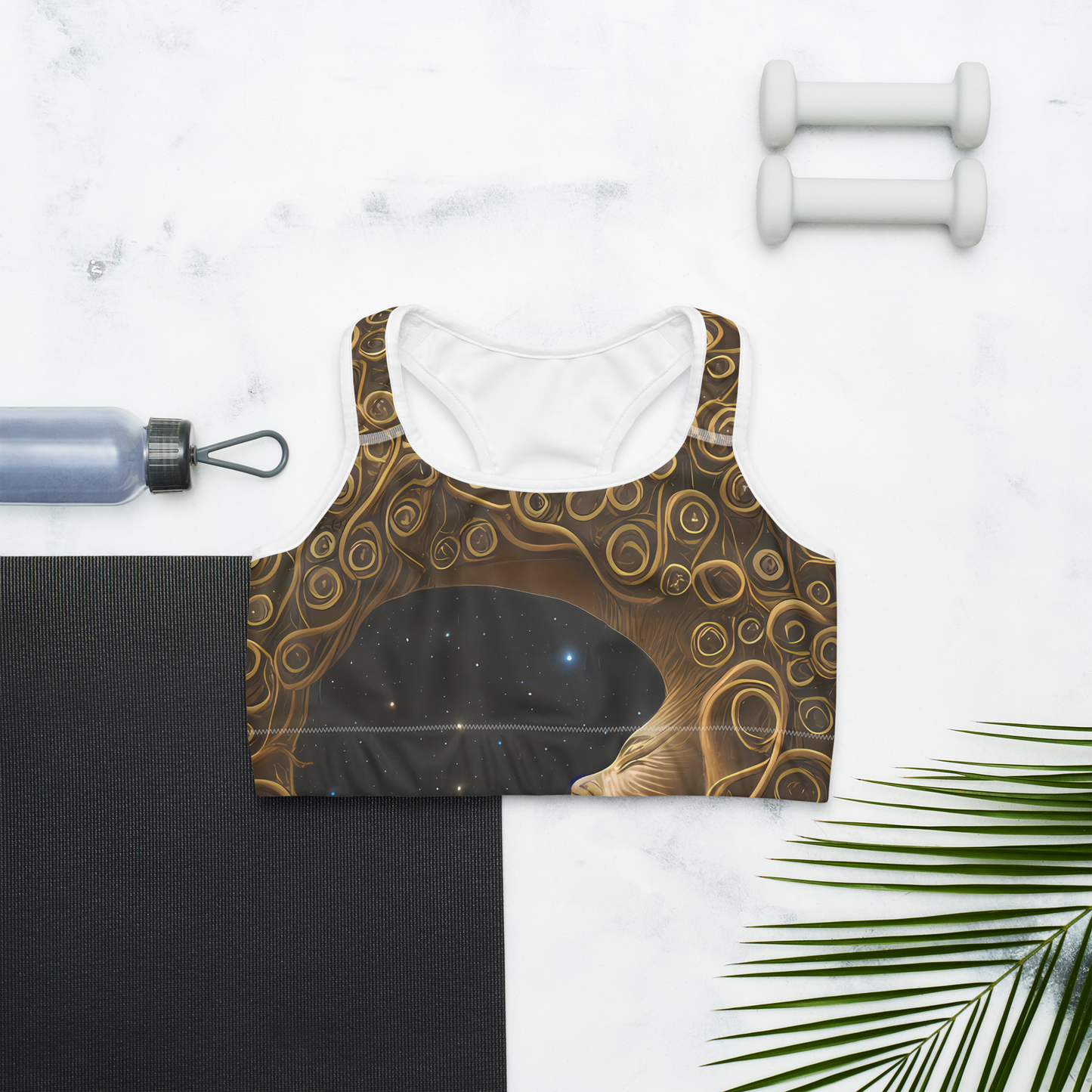 Unleash the celestial enchantress within as you dive into your fitness regime with our latest sports bra, adorned in the "Ethereal Coils" design. Envelop yourself in the luxurious allure of golden spirals that dance across a night sky canvas, bringing a touch of cosmic elegance to your workout wardrobe. The contrast of the dark, starry background with the shimmering loops captures a blend of mystery and bold artistry, perfect for those who seek to make a statement while pursuing their fitness goals.