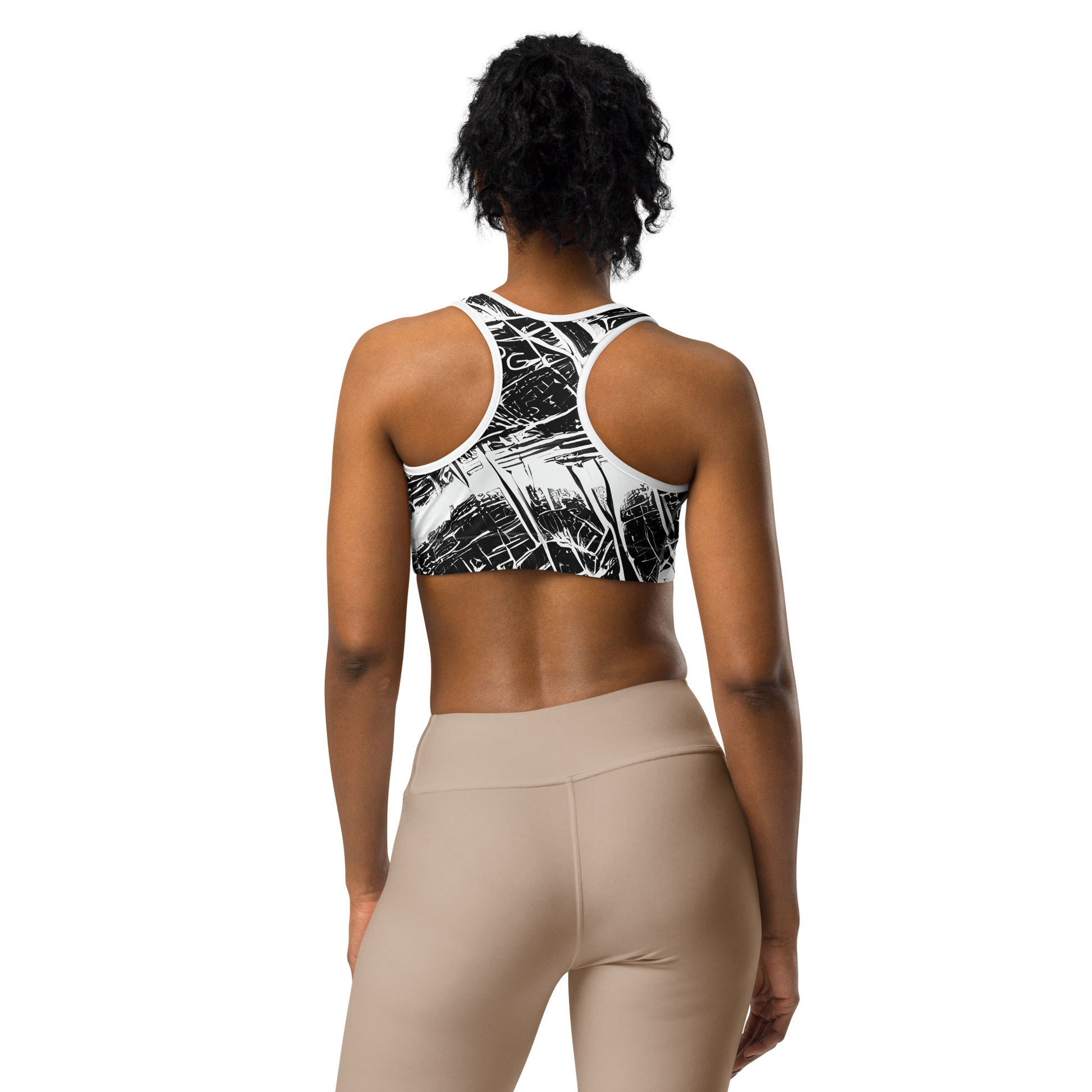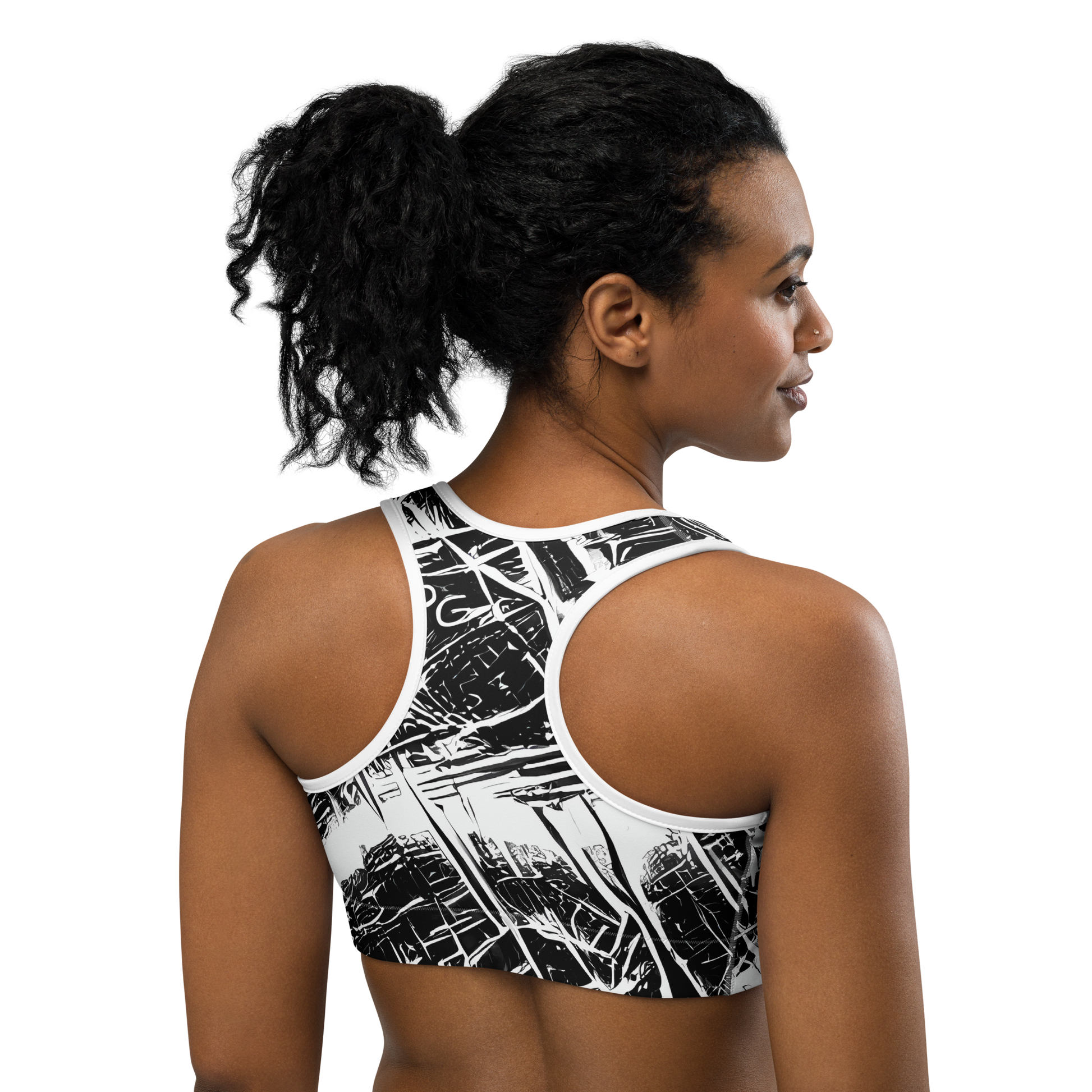 Elevate your workout with our AI-designed sports bra, featuring an exclusive pattern of bold, monochromatic black and white lines and geometric shapes. This design, reminiscent of urban architectural sketches, evokes a sense of modernist grandeur and dynamic cityscapes, perfect for those who appreciate the fusion of art and architecture in fashion. Ideal for making a statement at the gym or during any activity, this sports bra combines style, support, and advanced performance features.