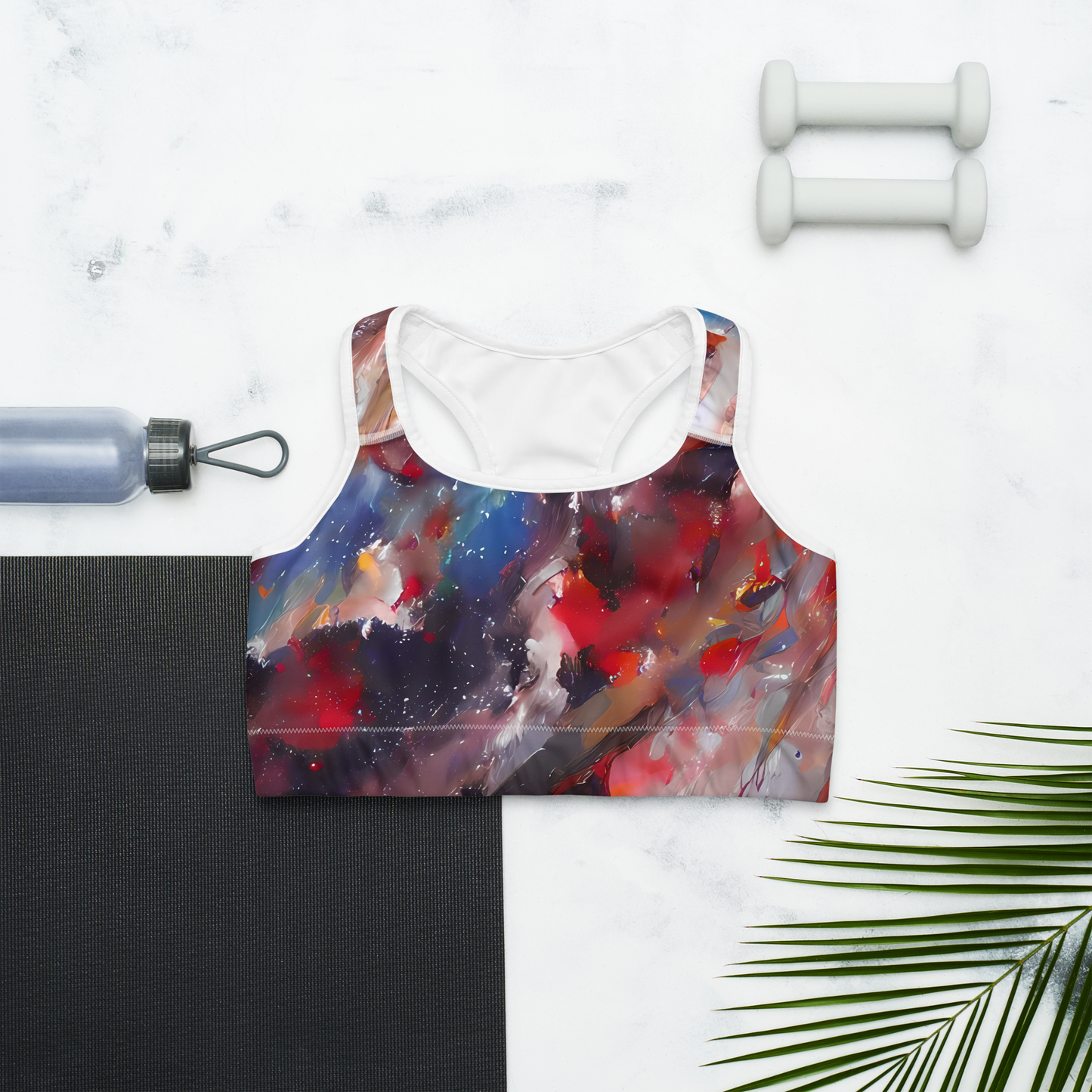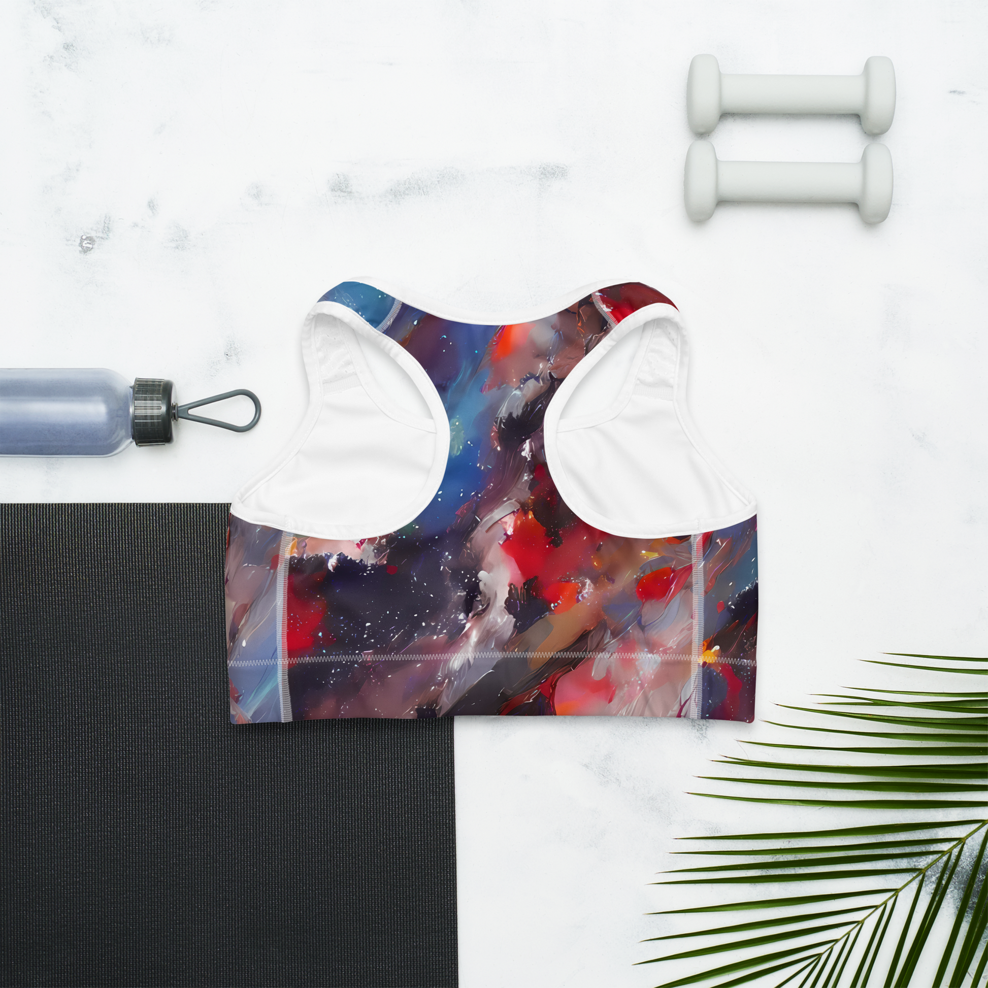 Ignite your fitness journey with the fiery allure of our "Passionate Brush" sports bra, a canvas of emotion and artistry. Inspired by the expressive strokes of Andre Kohn and Cecily Brown, this bra features a vibrant blend of rich reds, deep blues, and warm neutrals, with abstract forms and energetic splashes that demand attention. Perfect for those who live boldly and with passion, this piece is not just a sports bra, but a statement of creativity and vigor.