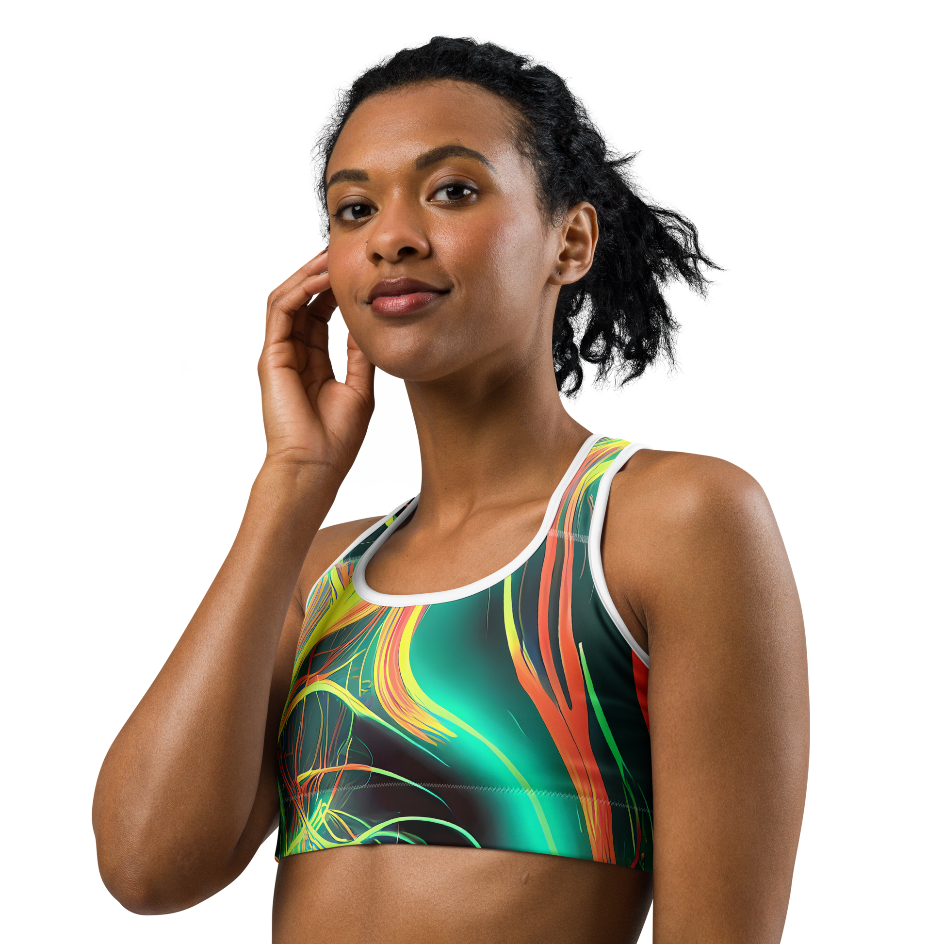 Unleash your inner artist and elevate your workout wardrobe with our "Vital Strands" sports bra! Featuring a mesmerizing pattern of fluorescent orange and yellow tendrils swirling against a deep teal backdrop, this unique design captures the essence of dynamic energy and creativity. Perfect for summer festivals or vibrant workouts, this bra not only offers stunning visual appeal but also ensures you stay comfortable and supported throughout your fitness journey.