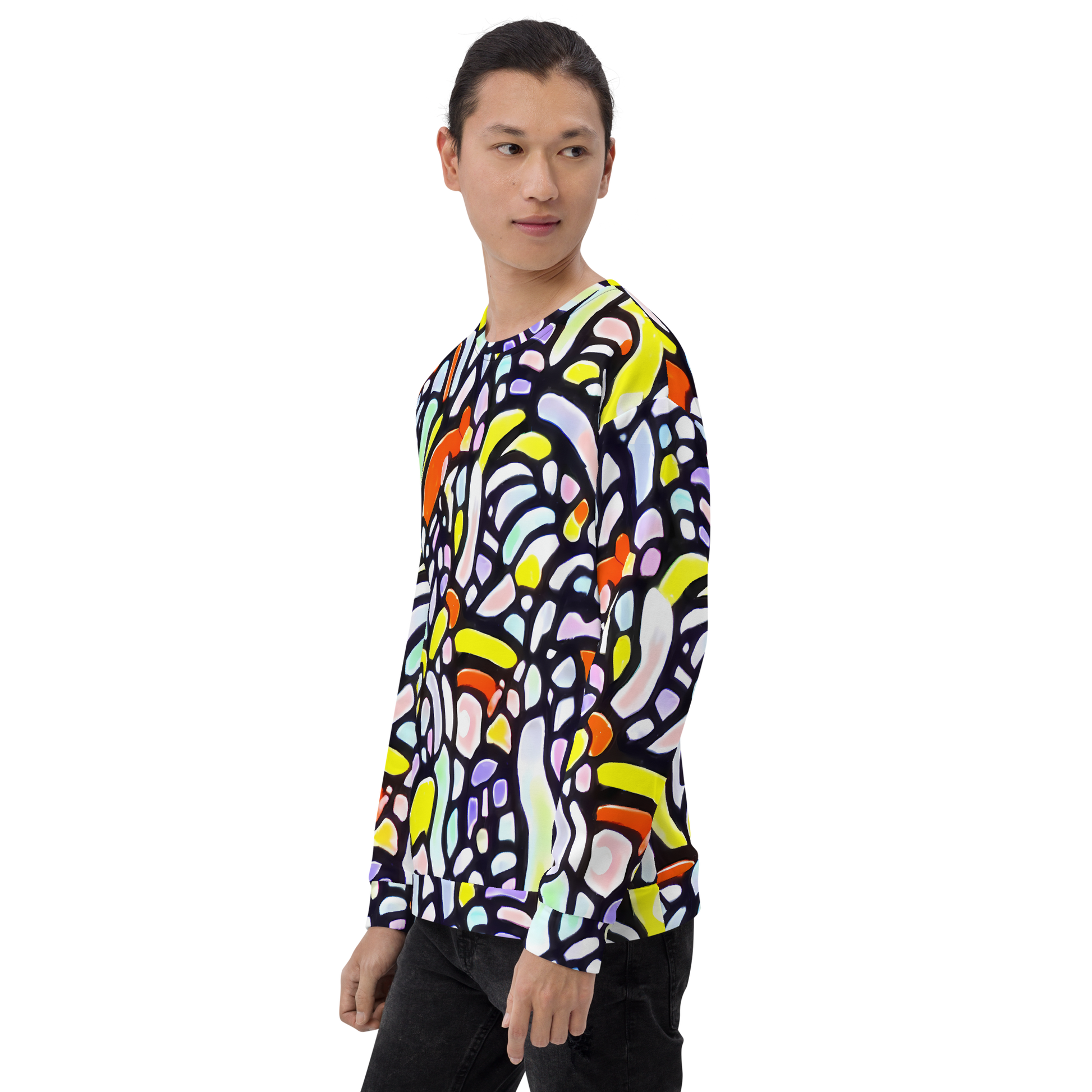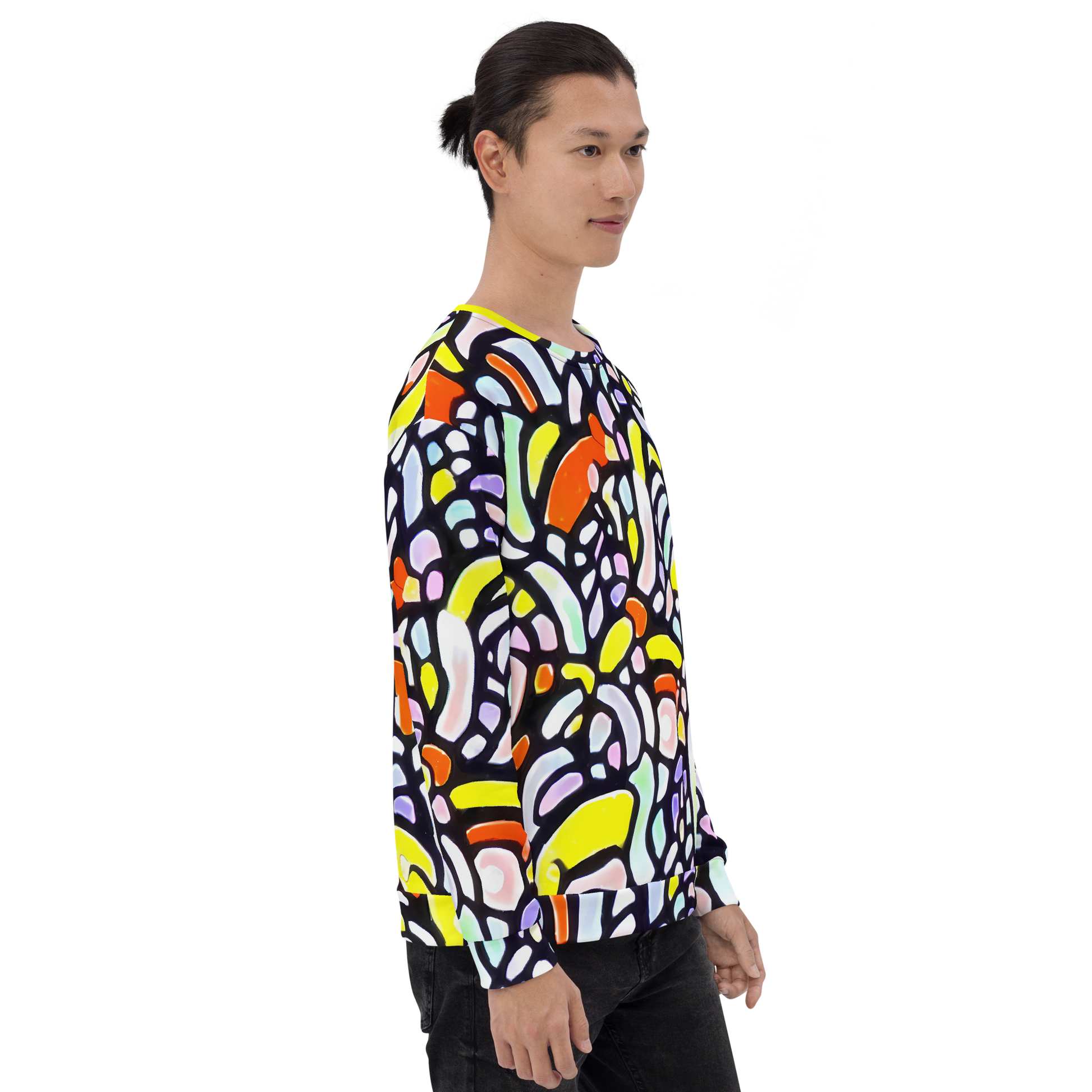 Step into a world where art meets apparel with our exclusive sweatshirt, adorned with a captivating all-over print that mirrors the energetic spirit of modernist masterpieces. Encased in bold, curvilinear shapes and outlined in striking black, the vivacious hues of orange, pink, yellow, and white dance across a stark canvas, creating an abstract interplay that's both avant-garde and exuberantly playful. Perfect for those who celebrate artistic expression and embrace a lively wardrobe for spring and summer outings, this sweatshirt is a statement piece for the fashionably daring.