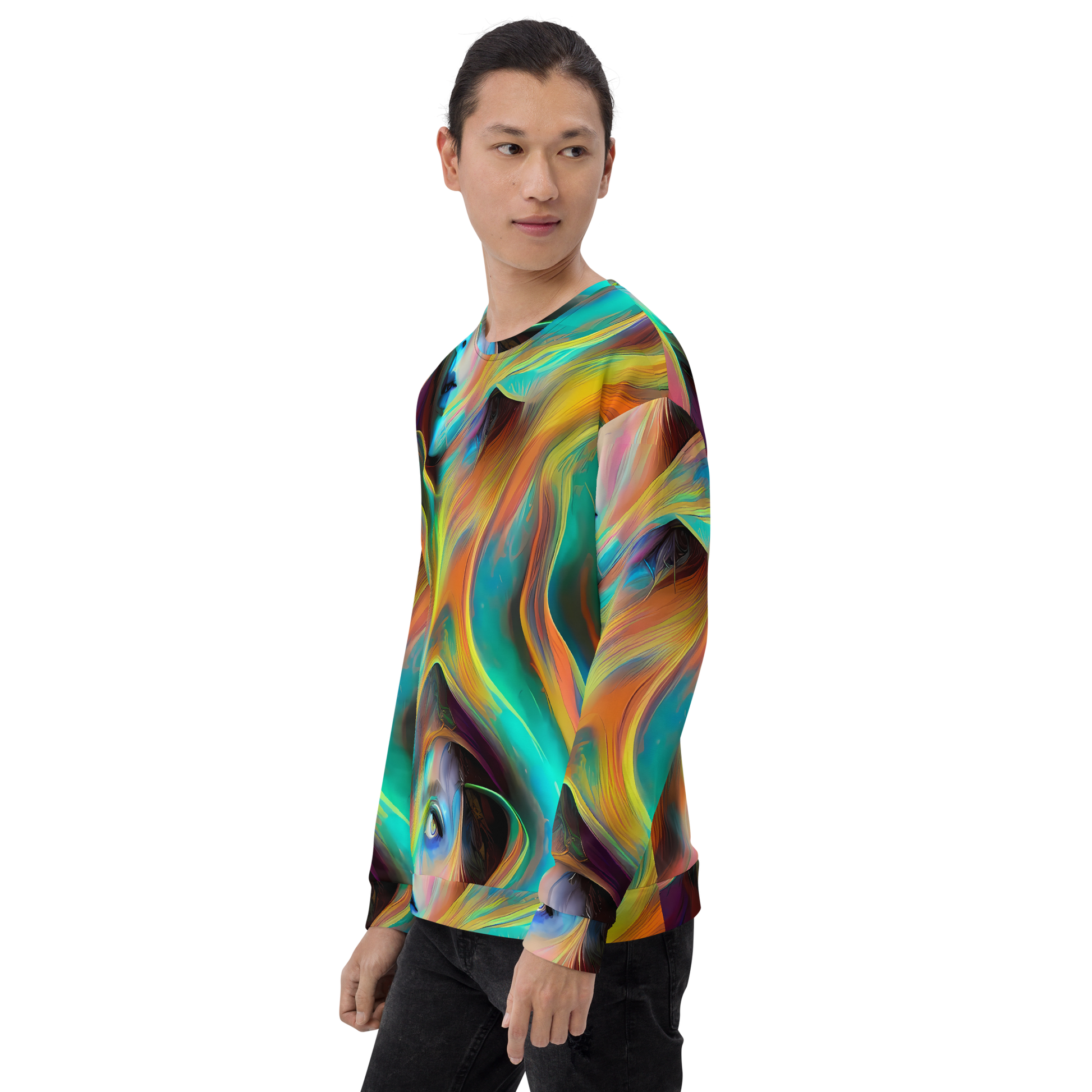 Step into a world of vibrant imagination with our AI-crafted all-over print sweatshirt, featuring a mesmerizing blend of electric blue, fiery orange, and neon green hues. This exclusive design, inspired by the fluidity of dreams and the intensity of emotions, is perfect for creative souls looking to make a bold statement. Crafted from eco-conscious fabric and tailored for luxurious comfort, this sweatshirt offers a unique and stylish addition to your wardrobe.