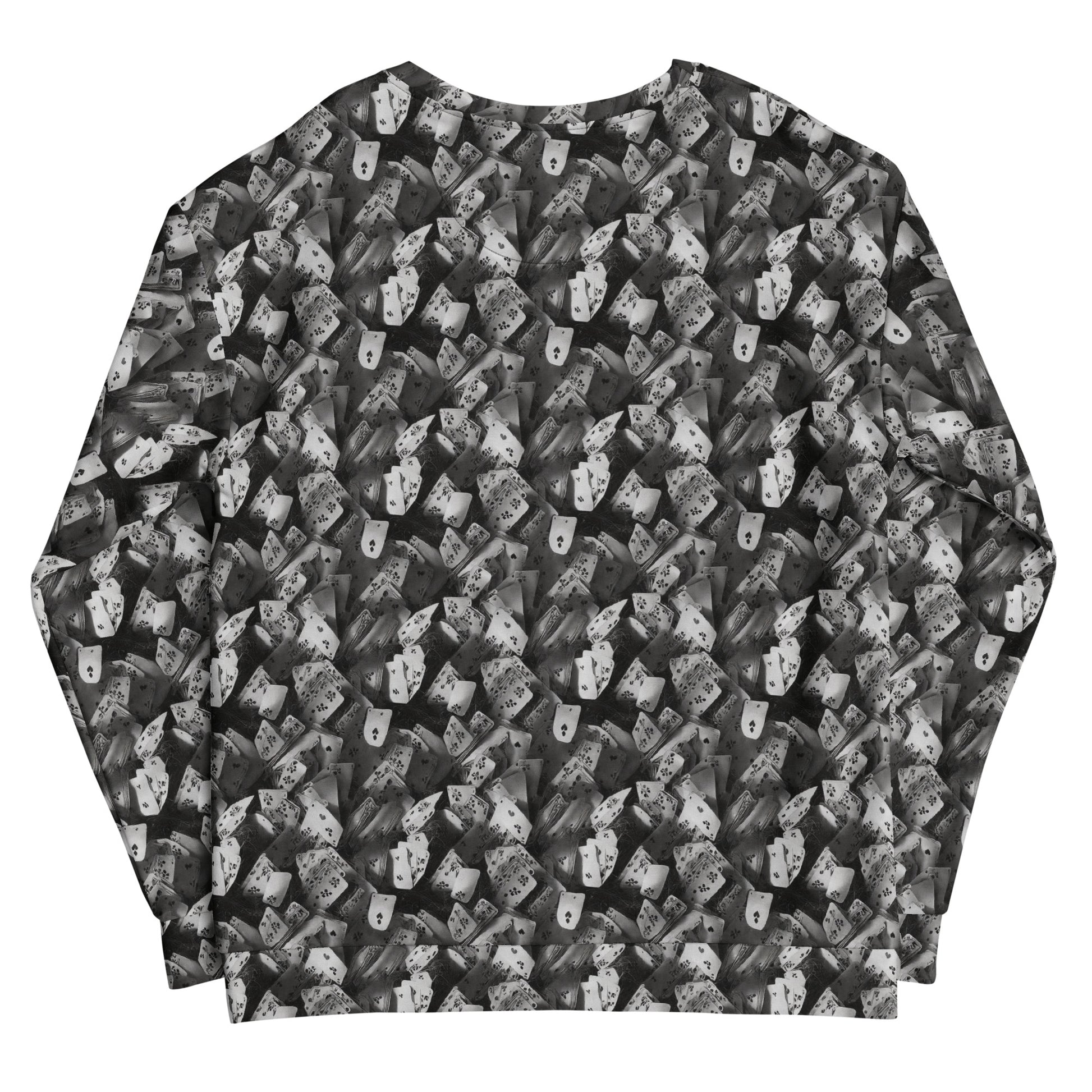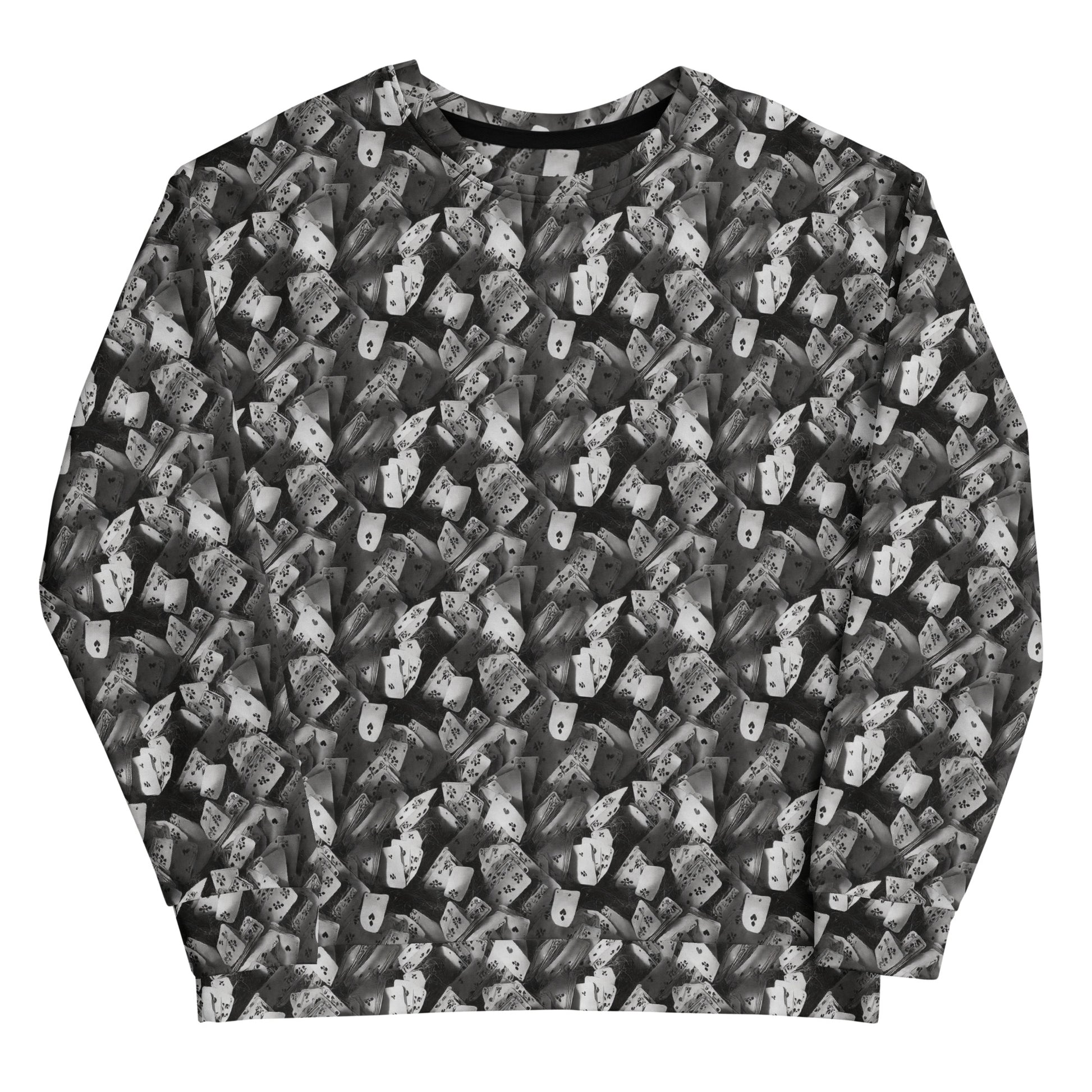 Step into a world of whimsy and mystery with our "Fortune’s Folly" all-over print sweatshirt. This unique piece features a captivating monochrome pattern that intertwines the playful chaos of scattered playing cards with a surreal, dreamlike texture. Crafted for the adventurous spirit, this sweatshirt not only showcases your individuality but also wraps you in luxurious comfort, making it perfect for autumnal gatherings or avant-garde events. Elevate your wardrobe with a statement piece that embraces the unexpected twists of life!