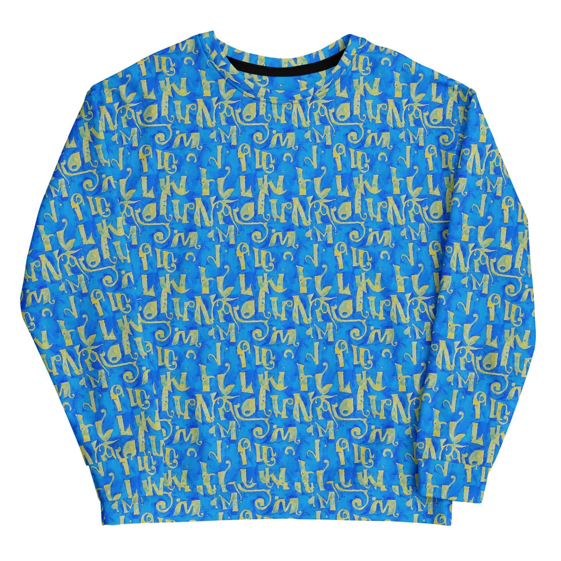 Step into a world of artistic expression with our "Golden Glyphs" all-over print sweatshirt, where vibrant shades of rich blue and shimmering gold come alive. This unique piece features abstract shapes reminiscent of ancient scripts, creating an aura of mystery and sophistication that’s perfect for art gallery openings or stylish urban gatherings. Wrapped in the cozy embrace of soft brushed fleece, this sweatshirt not only showcases your bold, creative personality but also ensures you stay comfortable and chic during the spring and summer months.