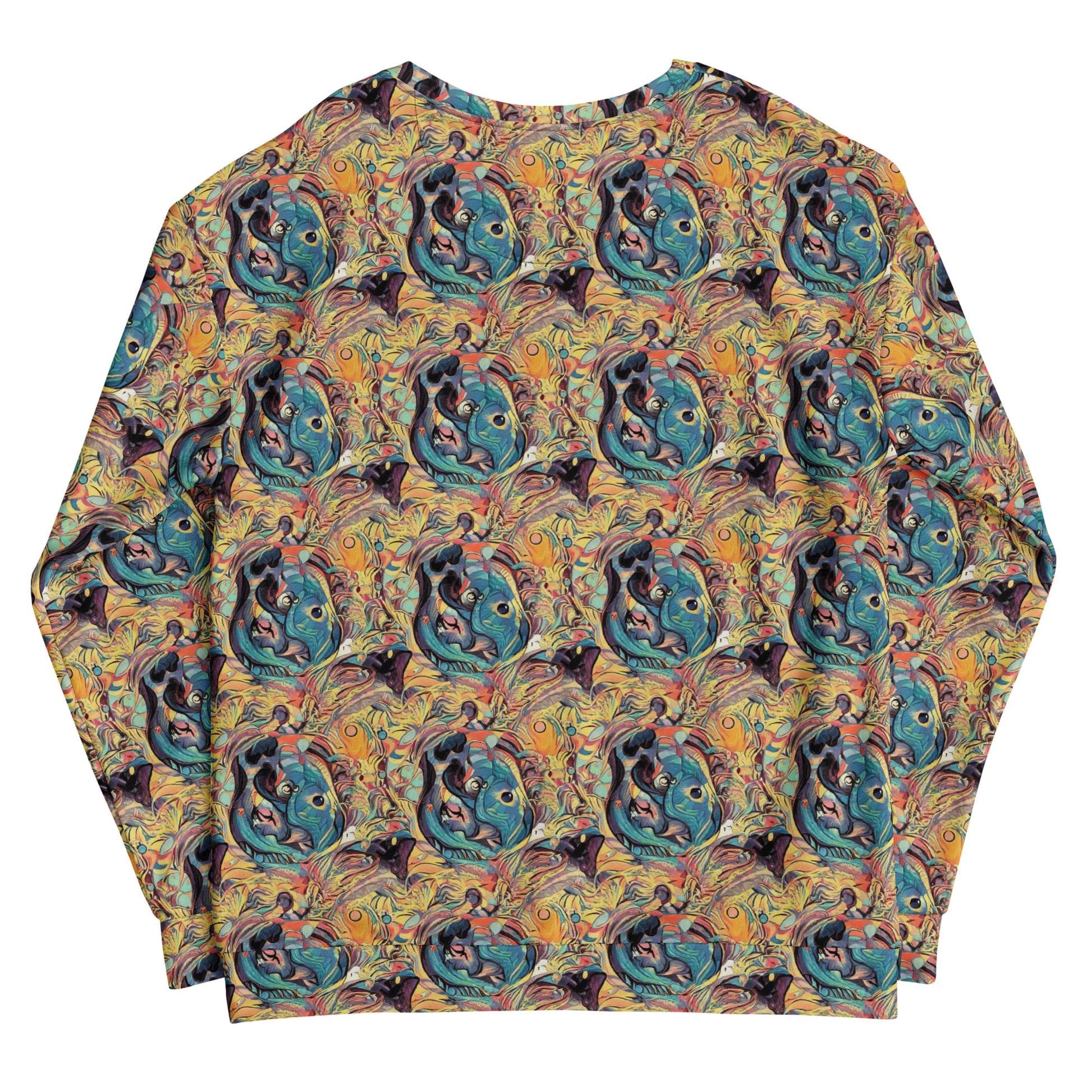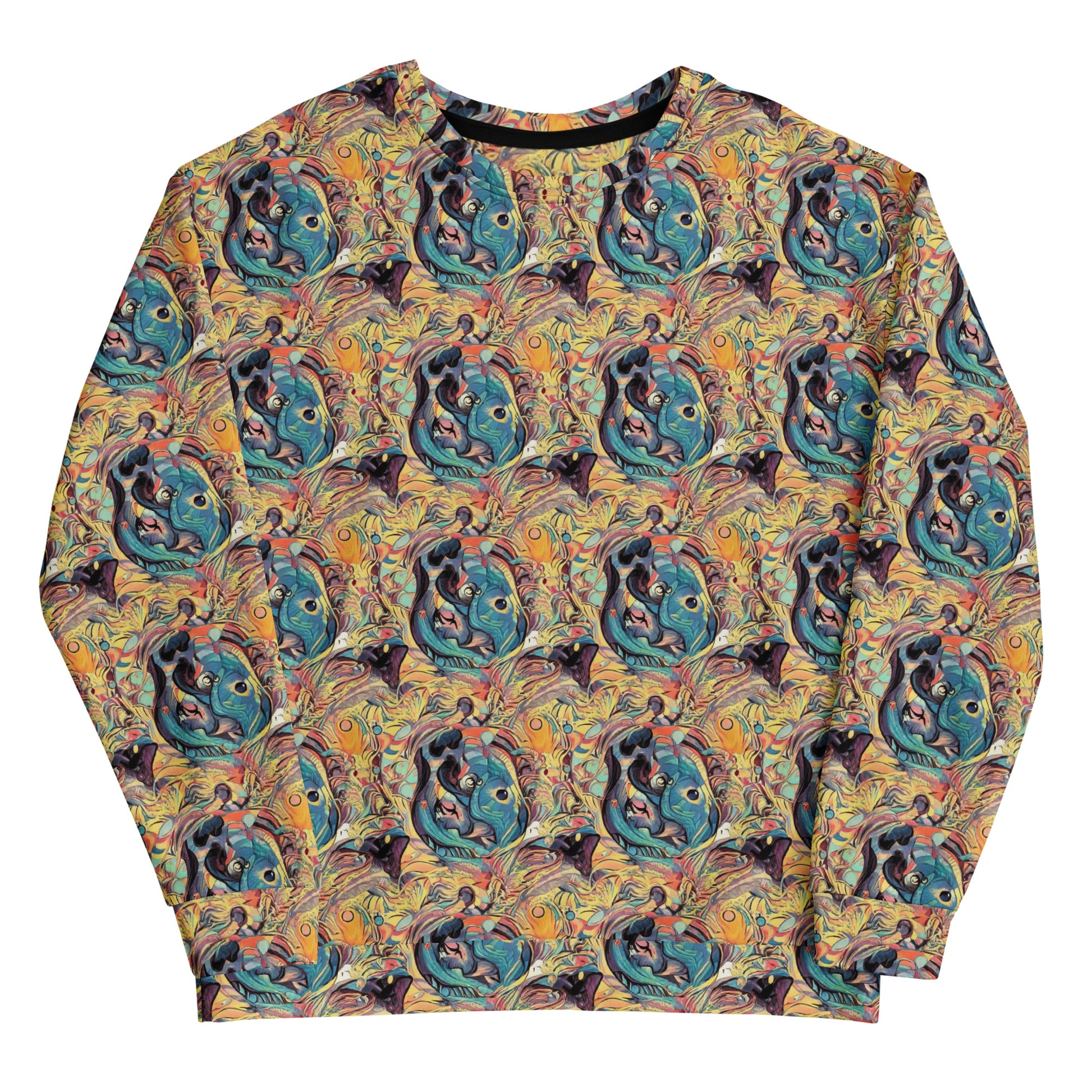 Step into a world of vibrant imagination with our "Harmonic Dream" all-over print sweatshirt. This captivating piece features a mesmerizing tapestry of swirling blues, fiery oranges, and soft yellows, reminiscent of a cosmic ballet infused with whimsical feline grace. Perfect for avant-garde gallery openings or eclectic summer festivals, this sweatshirt not only wraps you in personalized comfort but also makes a bold statement that reflects your artistic spirit.
