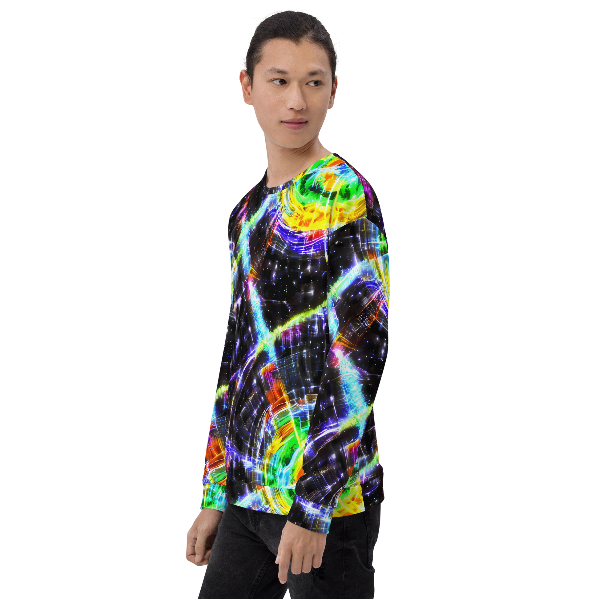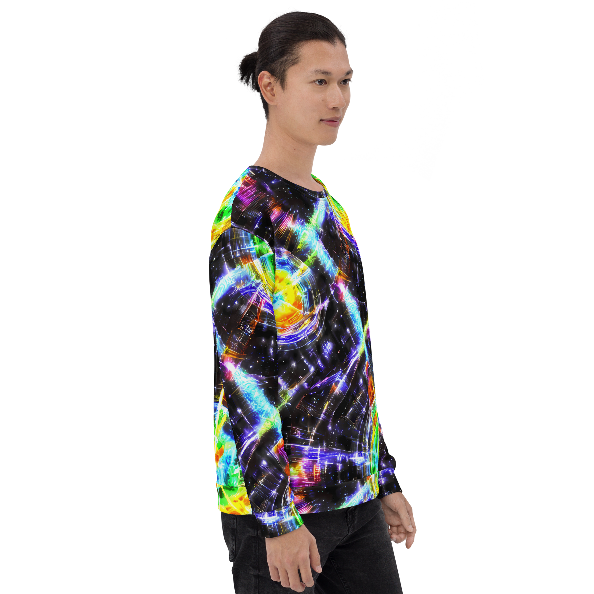 Unleash your inner artist with our AI-crafted all-over print sweatshirt, featuring a mesmerizing swirl of cosmic vibrancy. This kaleidoscope of neon hues—electric blues, radiant yellows, and fiery oranges—dances around black voids, evoking a sense of dynamic movement and emotional intensity. Perfect for creative events or avant-garde gatherings, this bold and imaginative design is a statement piece for any season.