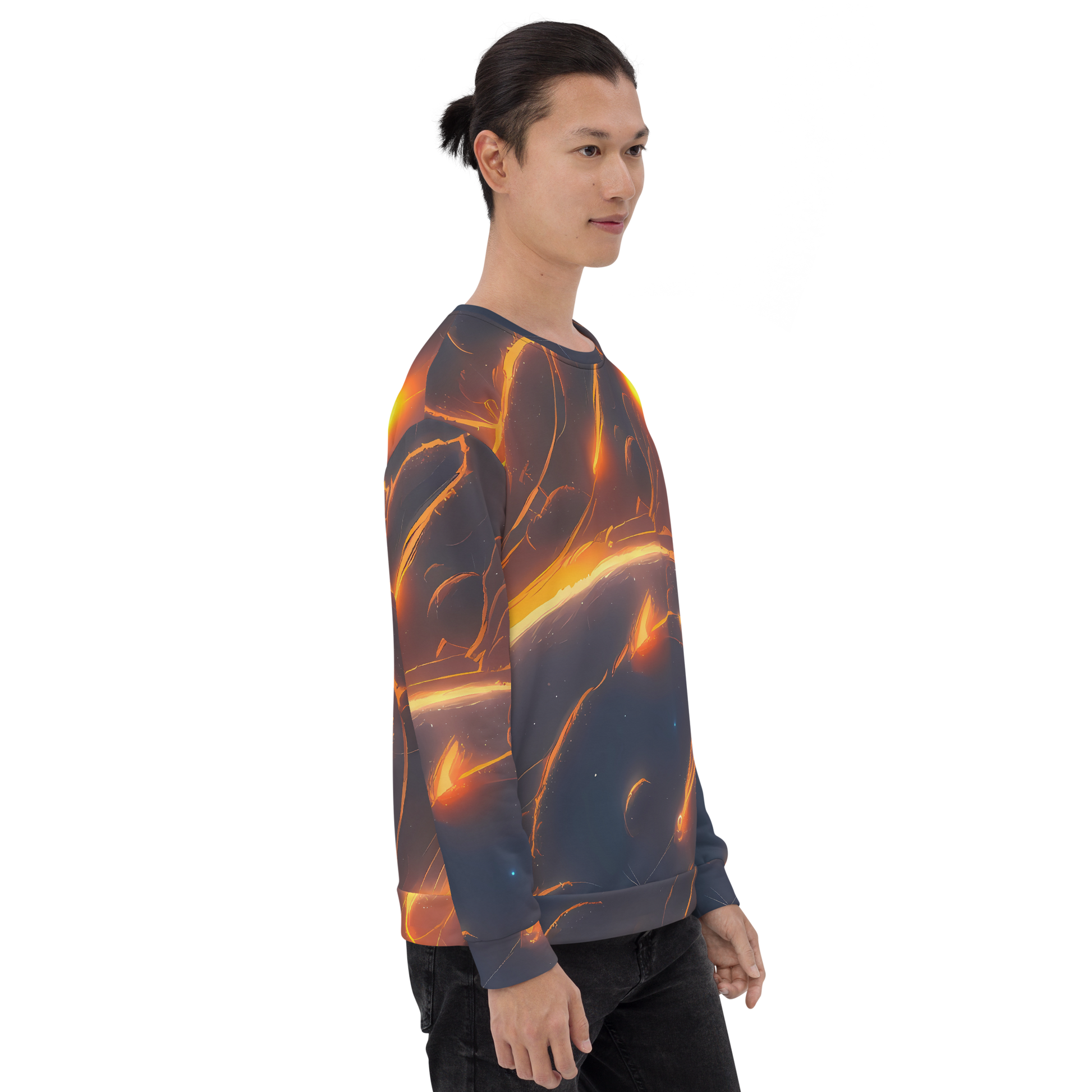Ignite your wardrobe with our mesmerizing all-over print sweatshirt, featuring a captivating design that embodies the essence of a fiery blaze and the serenity of the evening sky. The dynamic interplay of vivid orange and deep blue swirls creates a visual spectacle, reminiscent of the contrasting styles seen in the masterpieces of renowned artists. This piece is not just a garment; it's wearable art that expresses your bold and vivacious spirit, perfect for standing out at autumn gatherings or when you want to make an unforgettable impression.