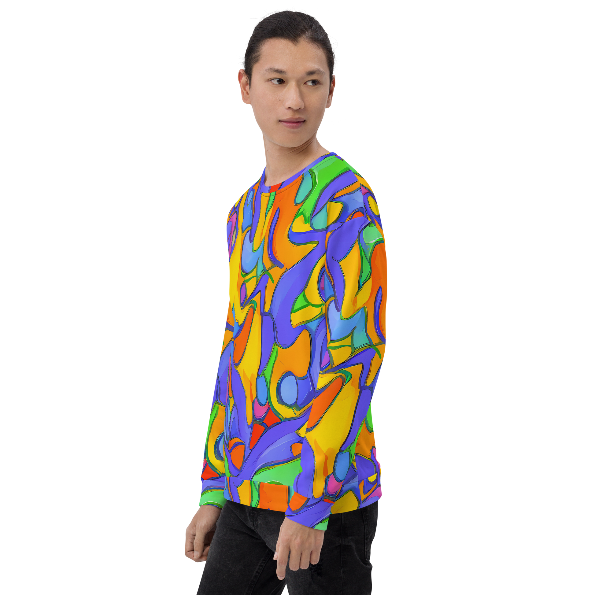 Ignite your wardrobe with a burst of artistic brilliance in our all-over print sweatshirt, featuring a mesmerizing pattern that dances with a kaleidoscope of electric blues, sunny yellows, and bold oranges. Splashes of green and purple add depth to this dynamic design, reminiscent of the spontaneous brushwork of a renowned artist. Perfect for those who celebrate self-expression, this sweatshirt is your canvas for making a bold statement at creative gatherings or art events during the warmer seasons.