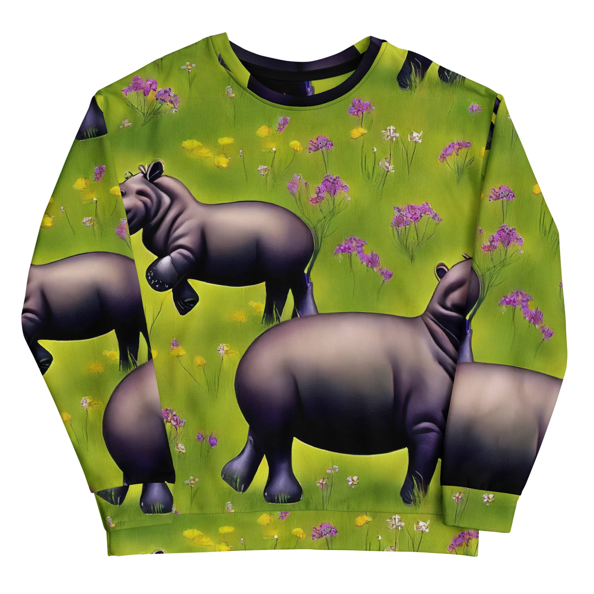 Step into a world of playful elegance with our "Verdant Safari" all-over print sweatshirt, where whimsical baby hippos dance among vibrant wildflowers in a lush green paradise. This unique design radiates joy and serenity, making it the perfect companion for sunny spring outings or relaxed summer gatherings. Wrap yourself in the personalized comfort of this eco-conscious piece, crafted to celebrate your individuality while embracing the beauty of nature.